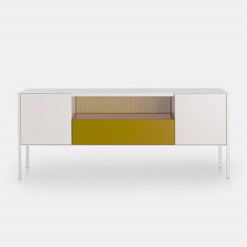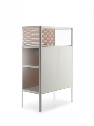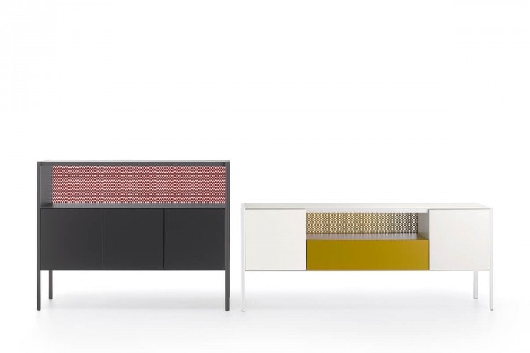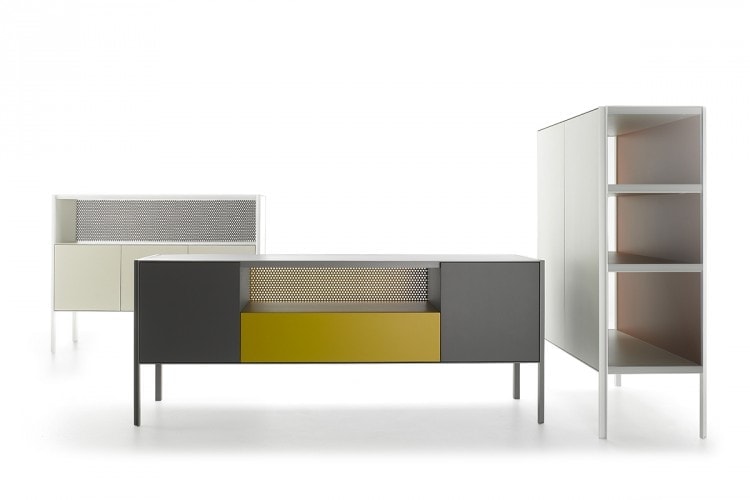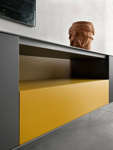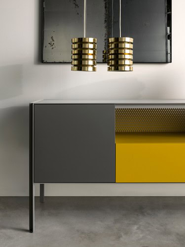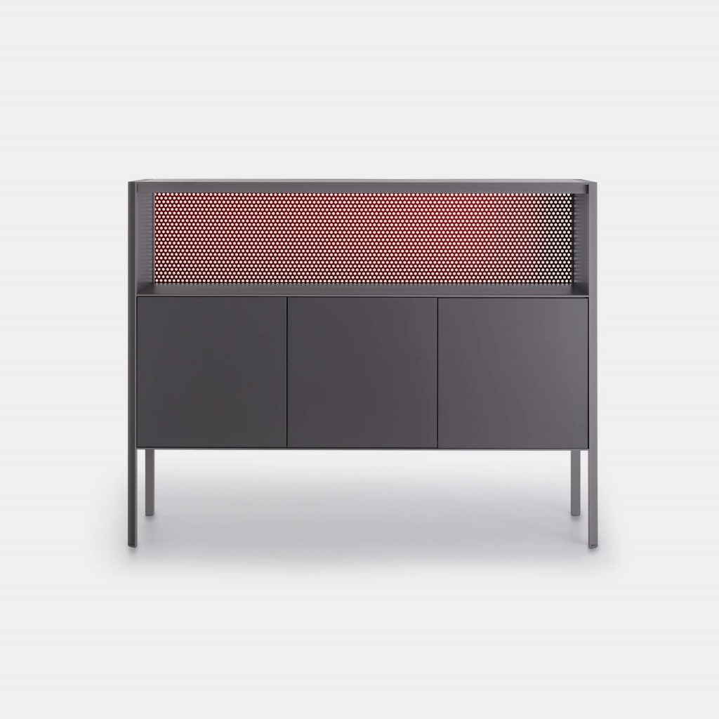 Side table on a metal structure finished in a dark gray, graphite color, table top in a natural black stone.