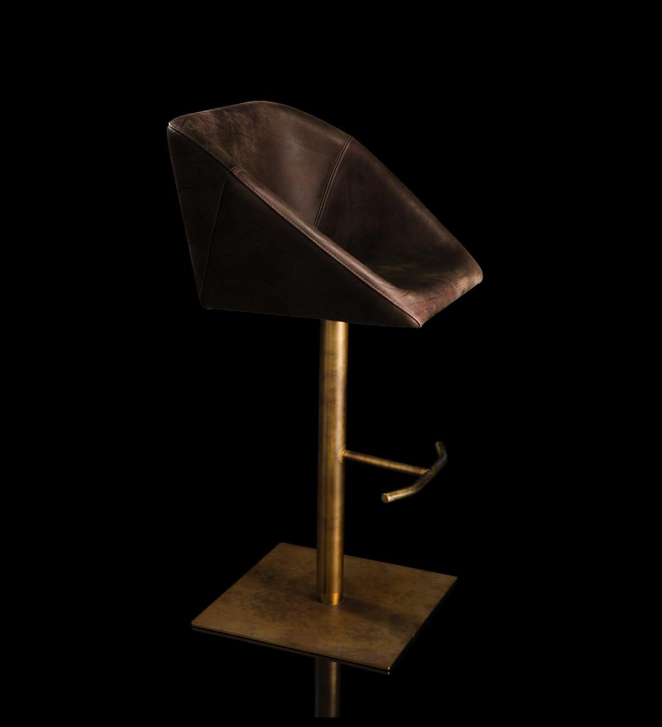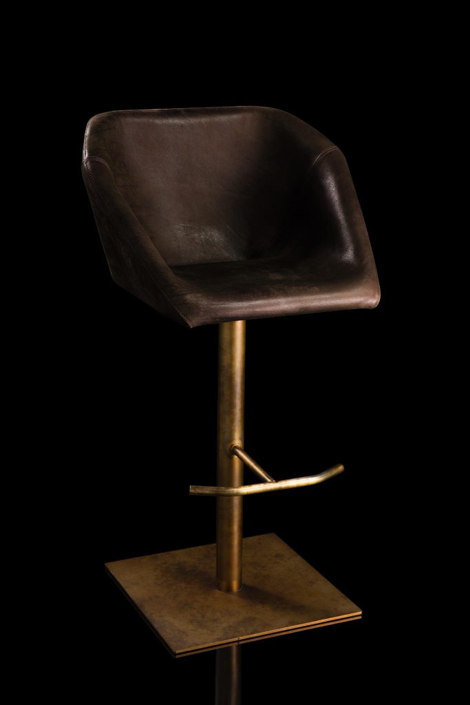 Stool with base in steel, padded seat covered with leather or fabric from our range. Base finish steel finish hand burnished brass using traditional techniques.