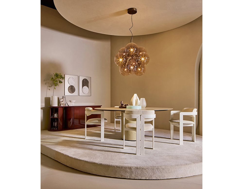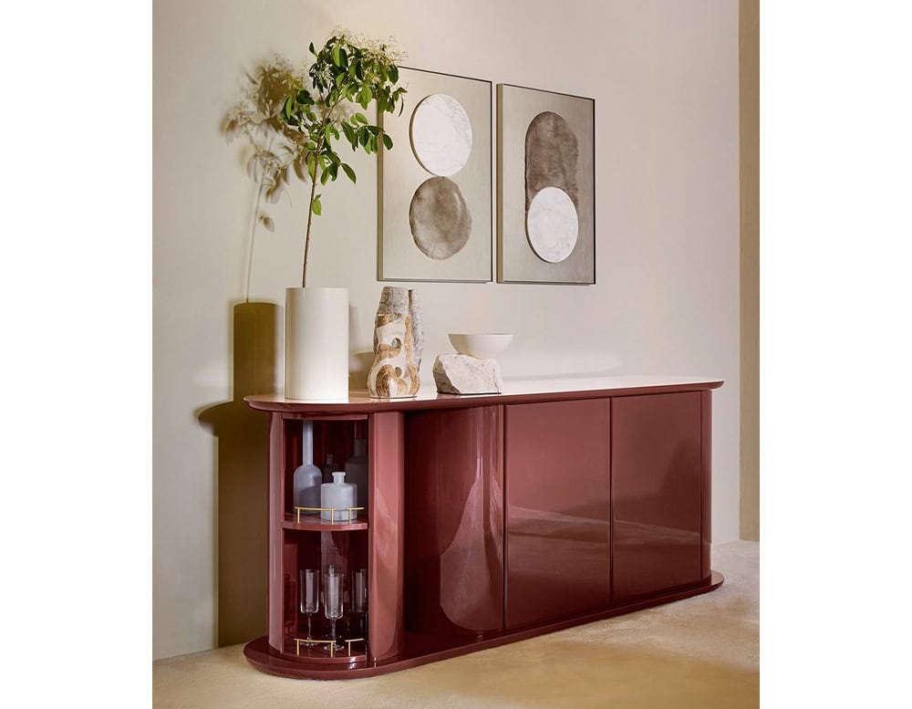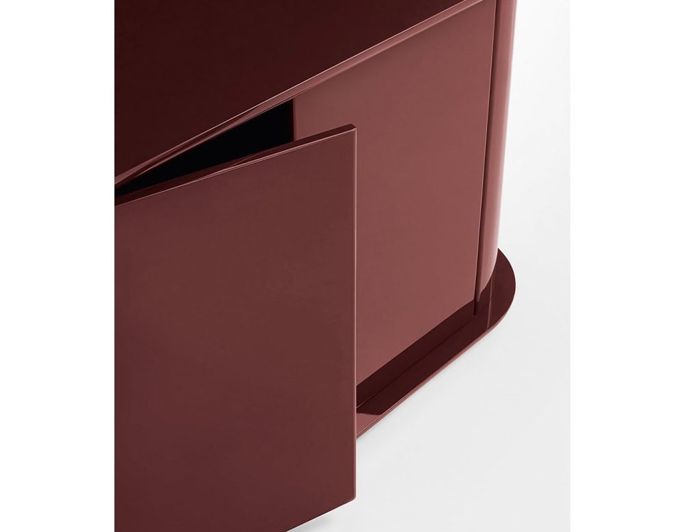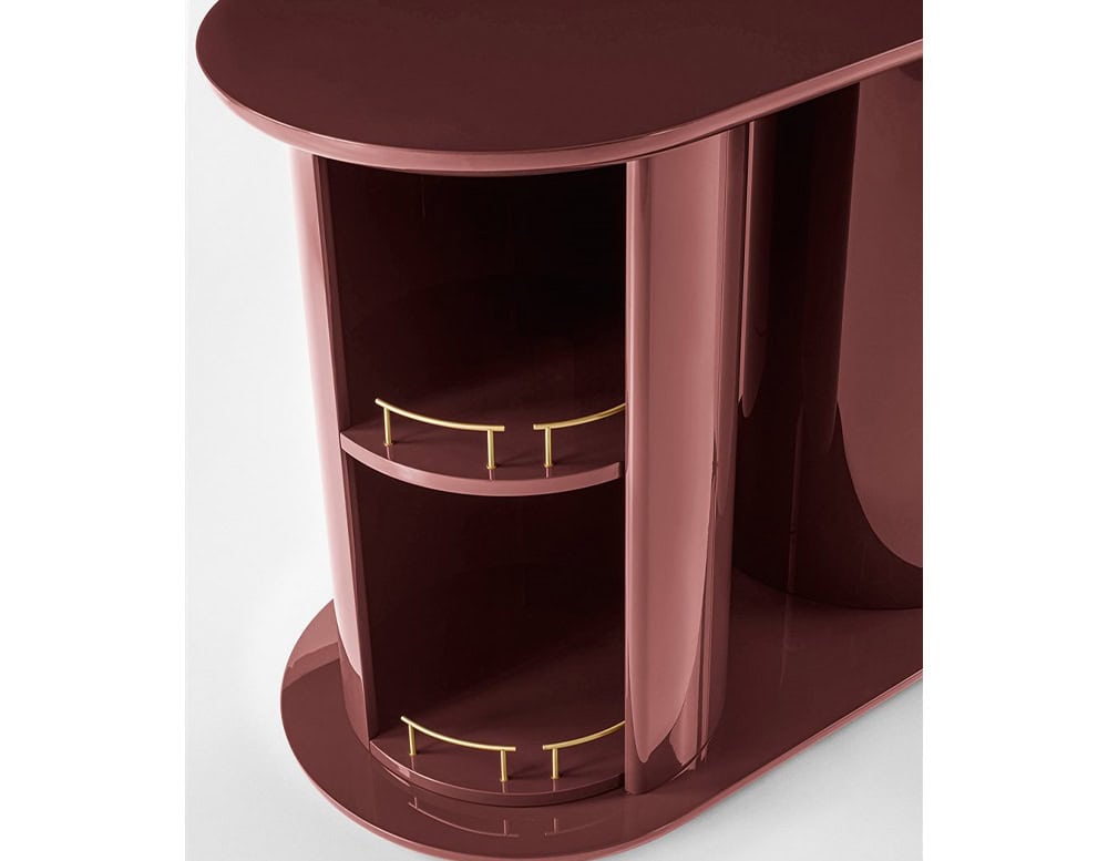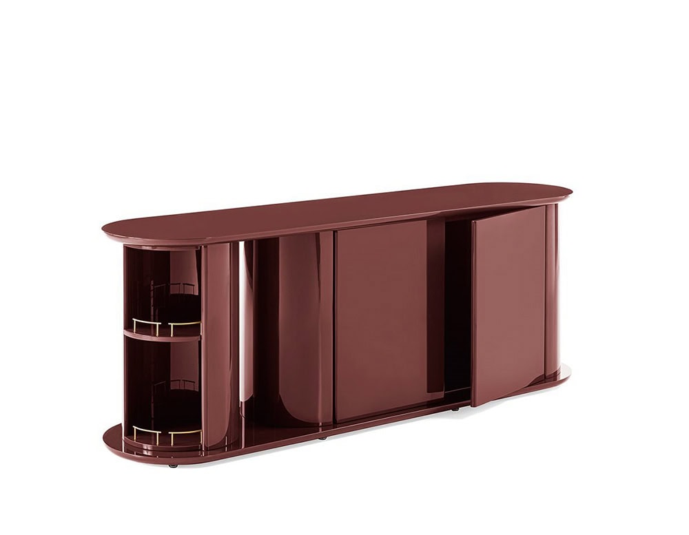 Sideboard with structure, shelves, doors and rotating half-cylinder in glossy or opaque lacquered wood. Available colours: Rosso Persia, Grigio Londra, Nero Giza, "Bianco Camargue", "Verde Provenza", "Blu Pacifico", "Bordeaux Etruria", "Rosa Jaipur" or "Sabbia del Nilo". Satin brass details. Unit with push and pull door with wooden lacquered shelf in the same finish. On request version with double-sided door opening.