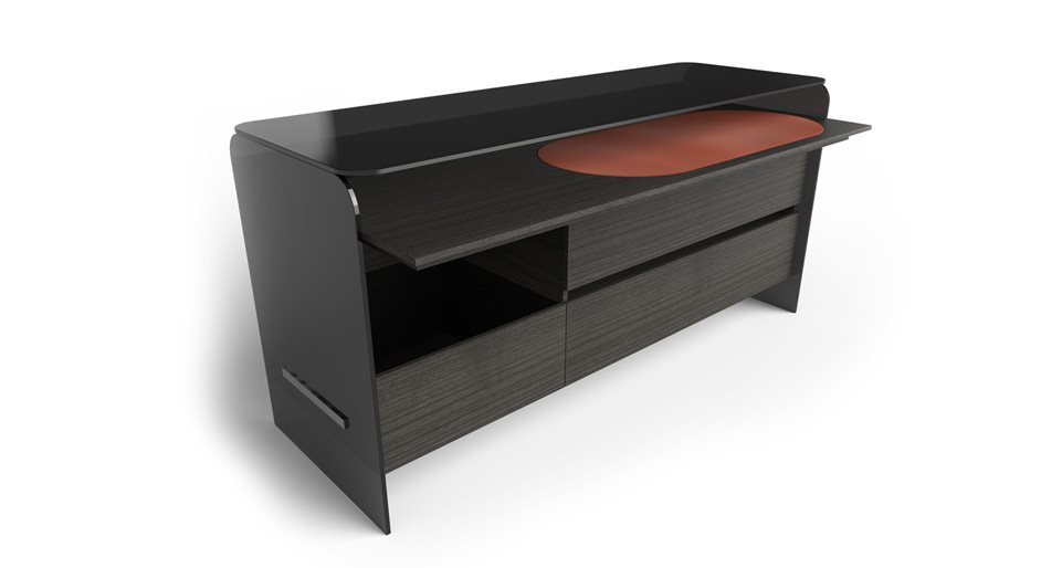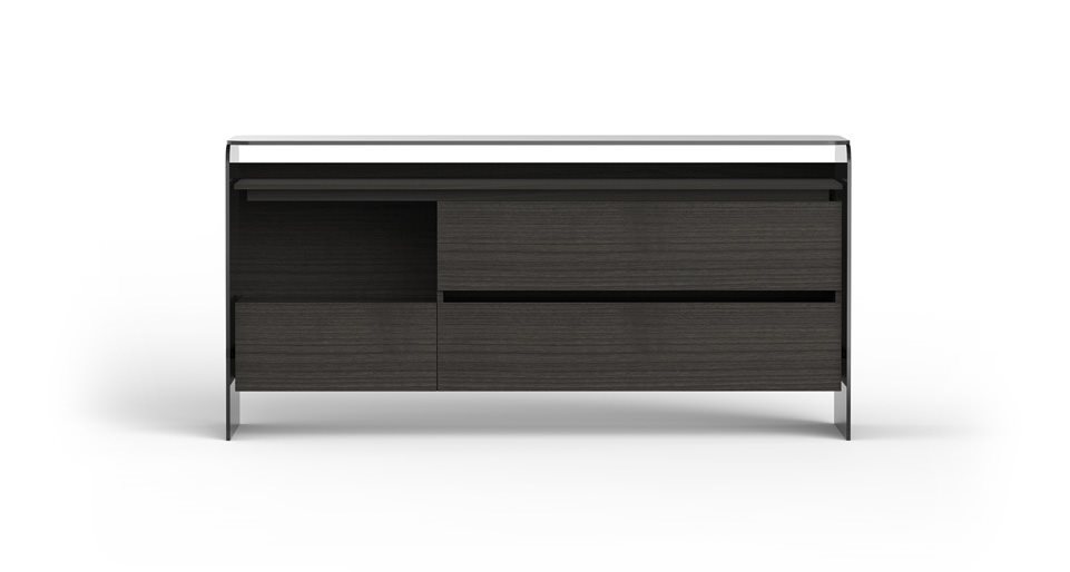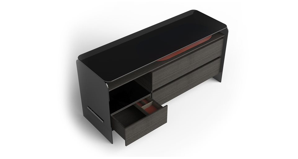 Chest of drawers with two big drawers, one small drawer, open module and pull out tray with velvet pad available as per samples. Drawers with total extraction runners. Structure and pull out tray in either black lacquered open pore ash or grey smoke lacquered open pore ash. Top and sides in 10 mm thick smoked Grigio Italia or extralight glass. Metal parts in brushed black anodized aluminium. Grey wooden accessories tray with velvet bottom to be placed inside the drawers on request. Velvet finishes as per samples.