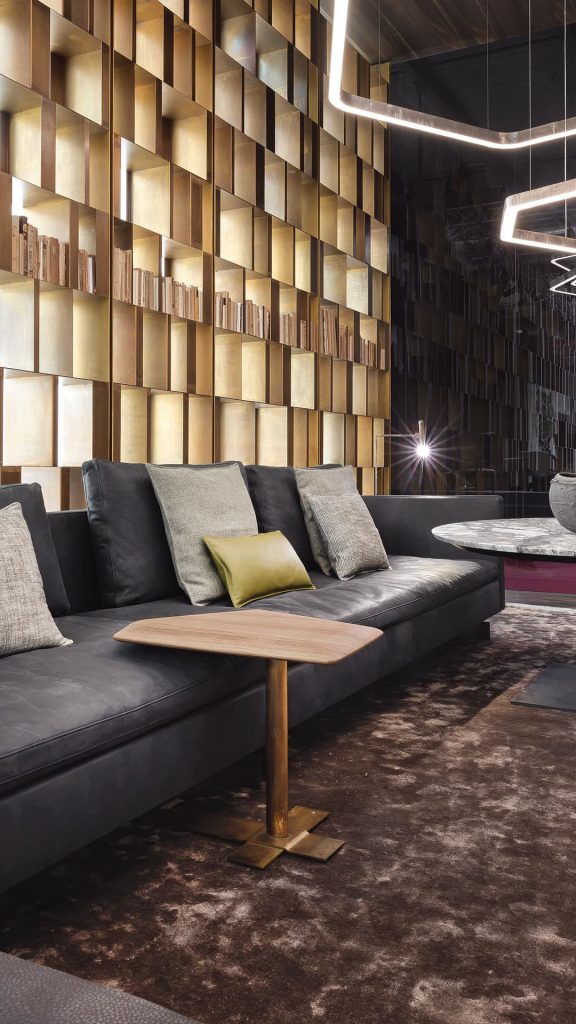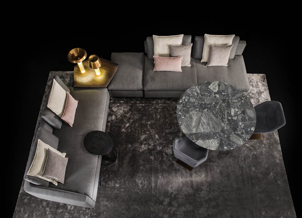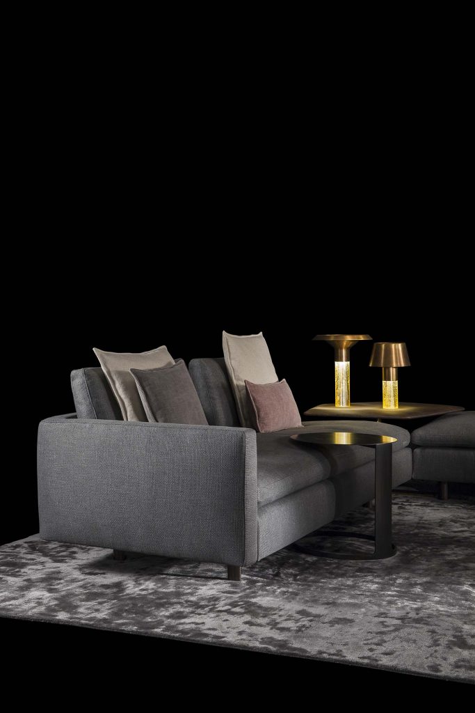 Structure in solid wood covered with polyurethane foam in different density. - Seat cushion under-seat in d/30 e polyurethane foam, seat top in d/30 eet polyurethane foam, covered with pad in d/40 pf polyurethane foam, seat front with 300 gr lap strip. Edge to edge seams on leather and nappa upholstery. Fabric version with perimetric lap-felled seam. - Back cushion padded with d/21 sm polyurethane foam backed with 200 gr resin sheet and down feather. - Base in steel black burnished or finish burnished brass. - Finishes of cover and piping fabric or leather from our samples catalogue category 300 or 400.