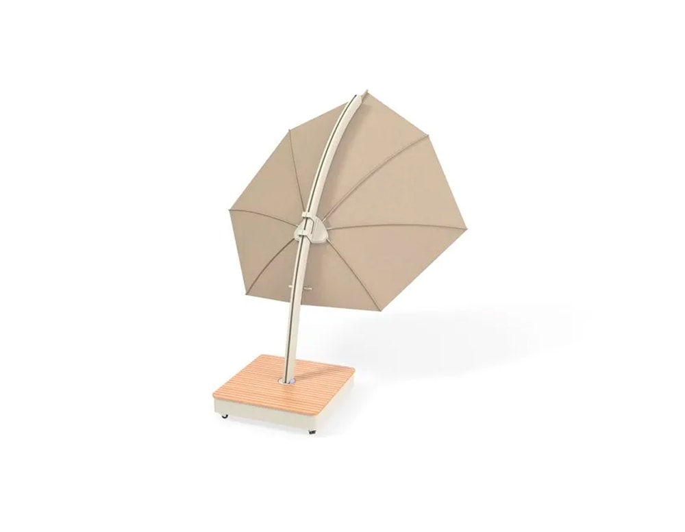 Octagon-shaped umbrella made of aluminum and light beige fabric in a white background