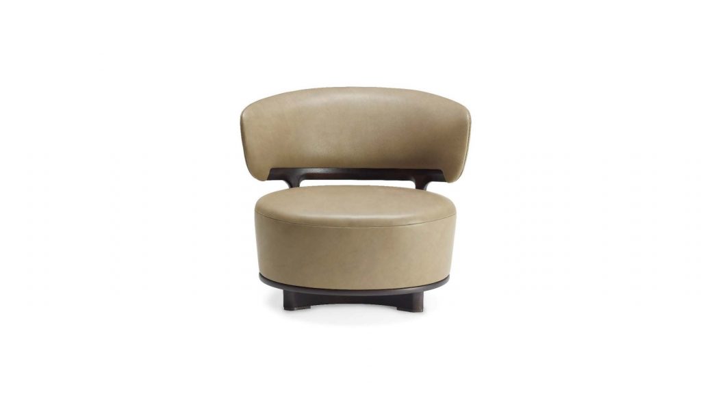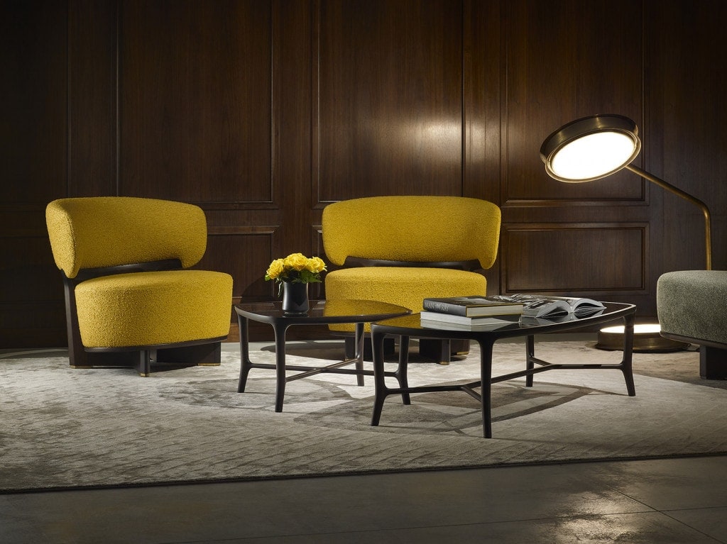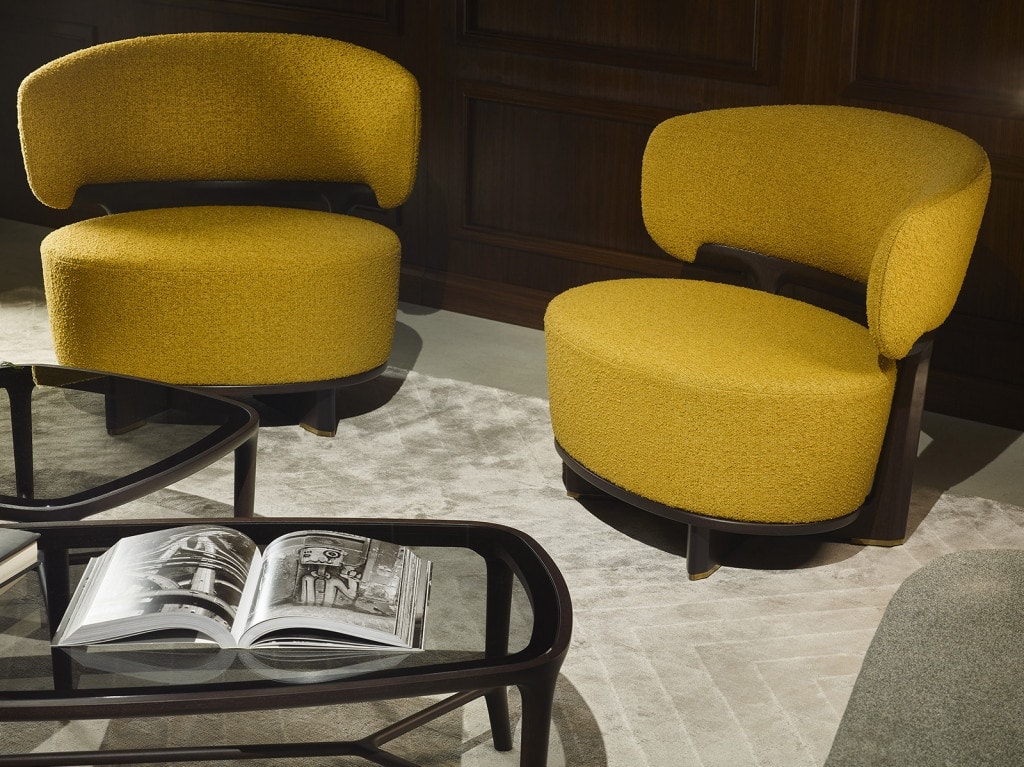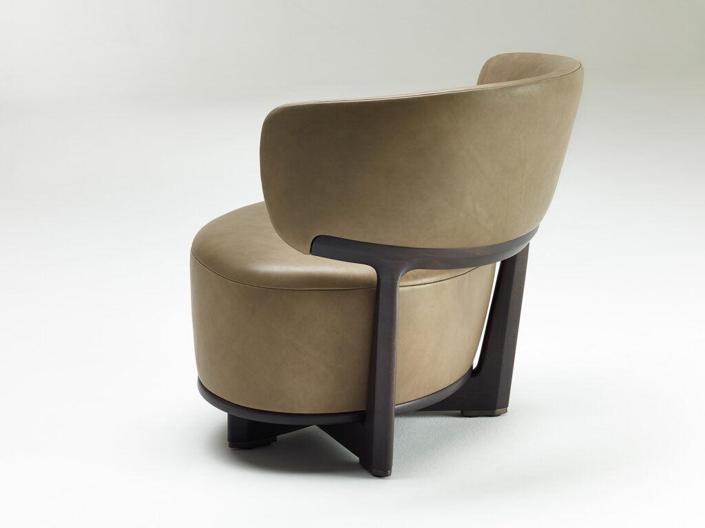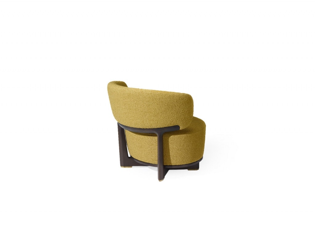 Armchair made in solid American walnut. Seat and back-rest in upholstered poplar plywood. Leg tips in brass.