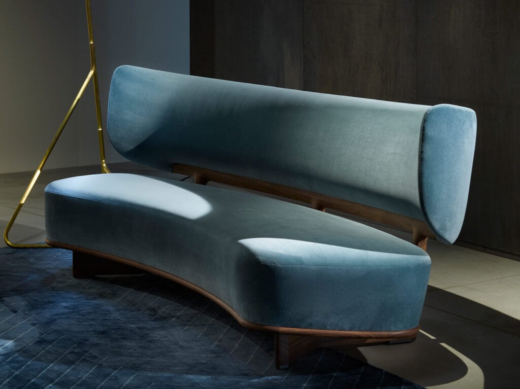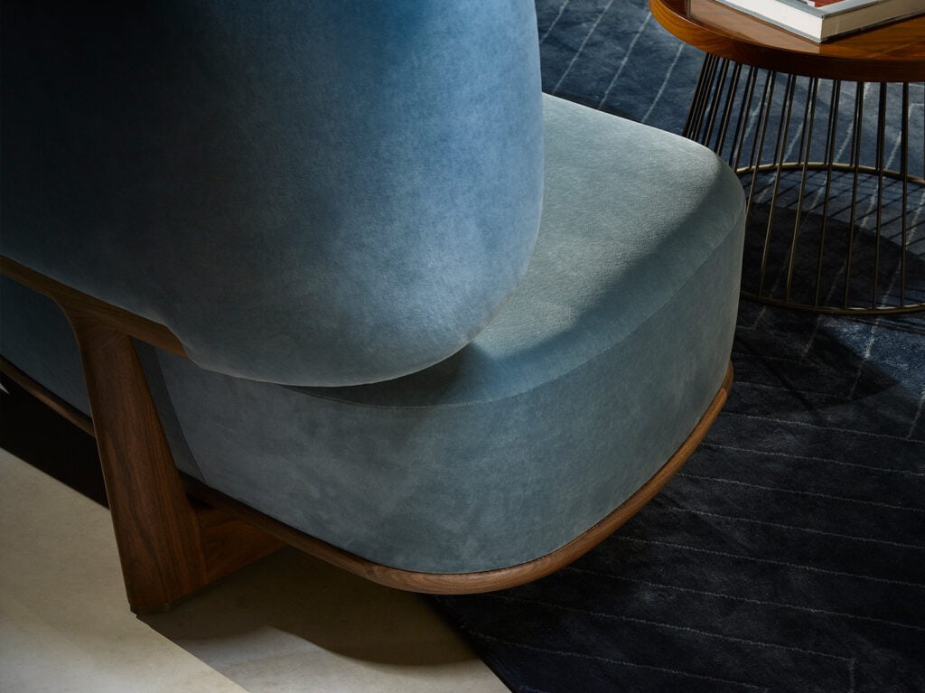 Considerable seat cushion and suspended backrest on a handcrafted solid wood structure.