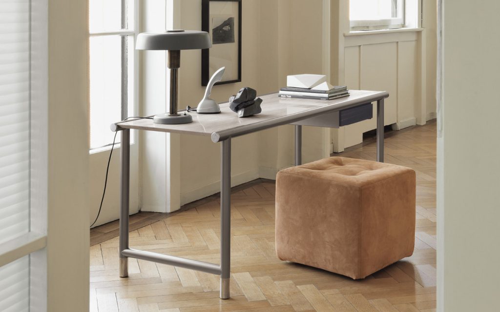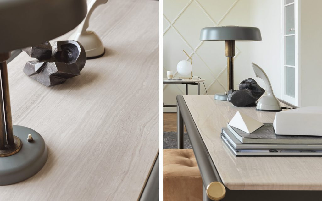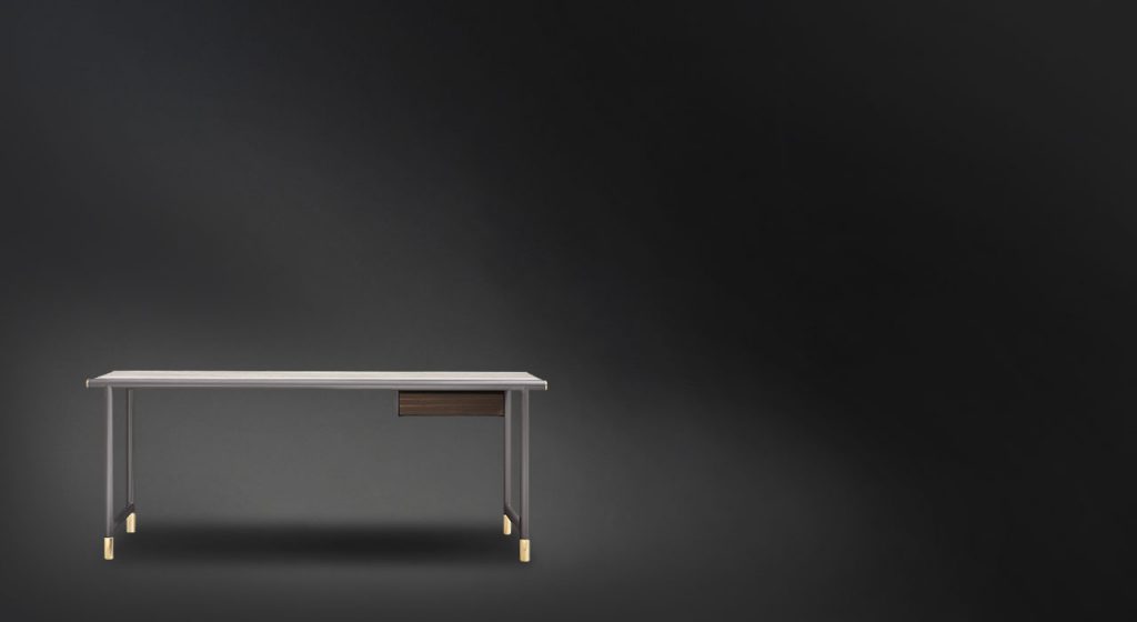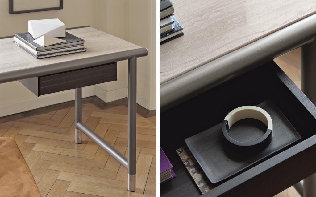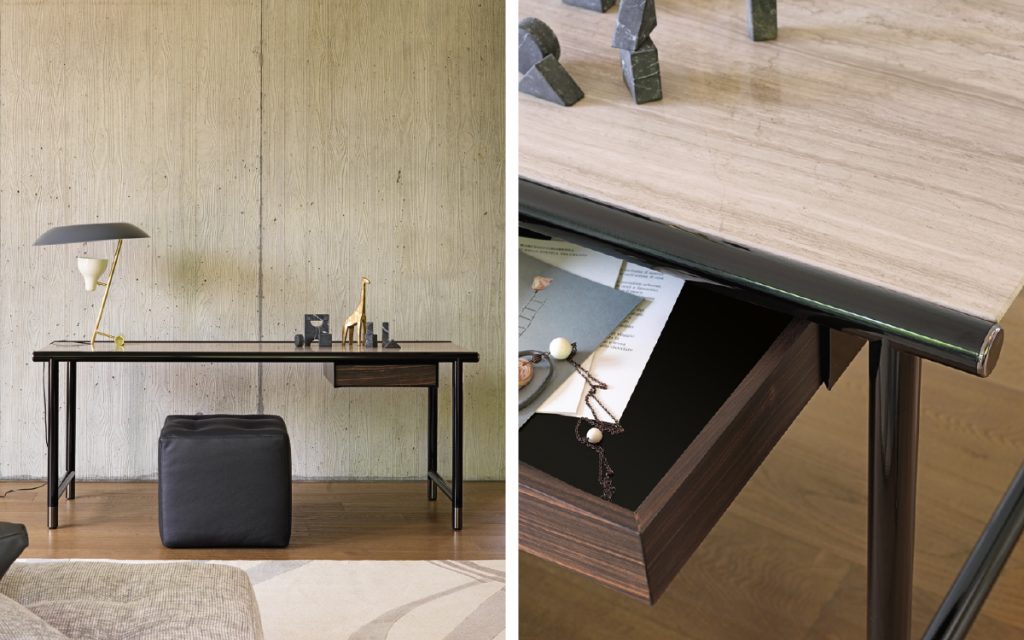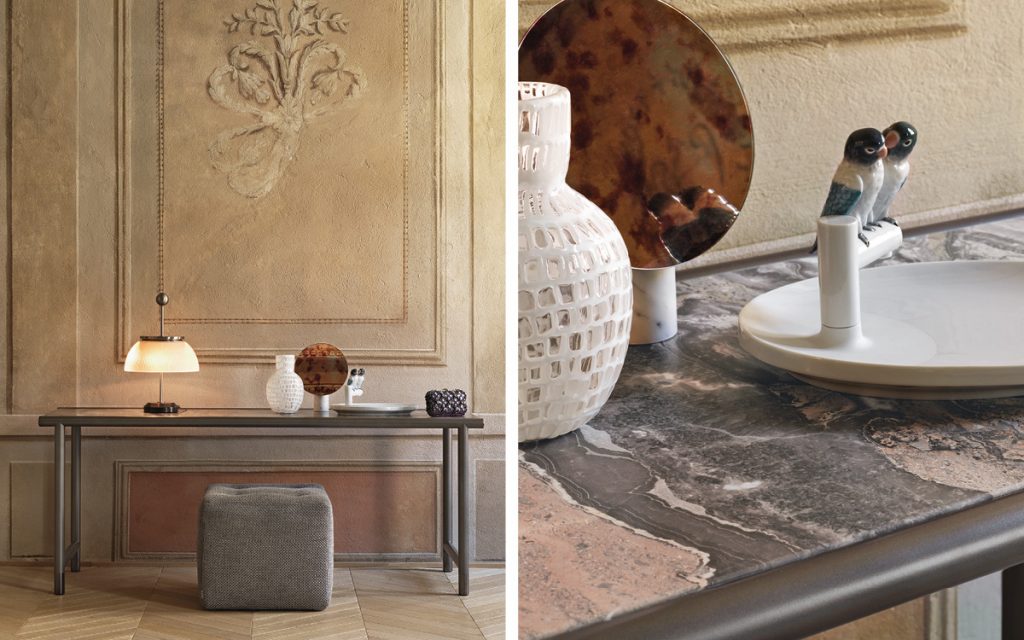 The console table can also be used as a writing desk and a shelf; the top is available in different marbles or in ebony.