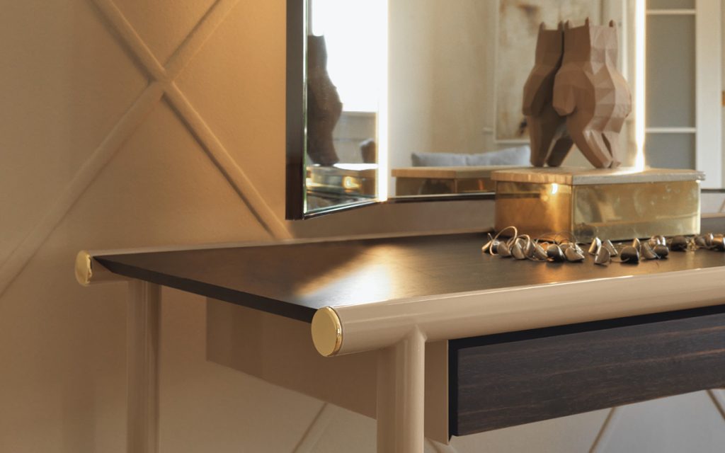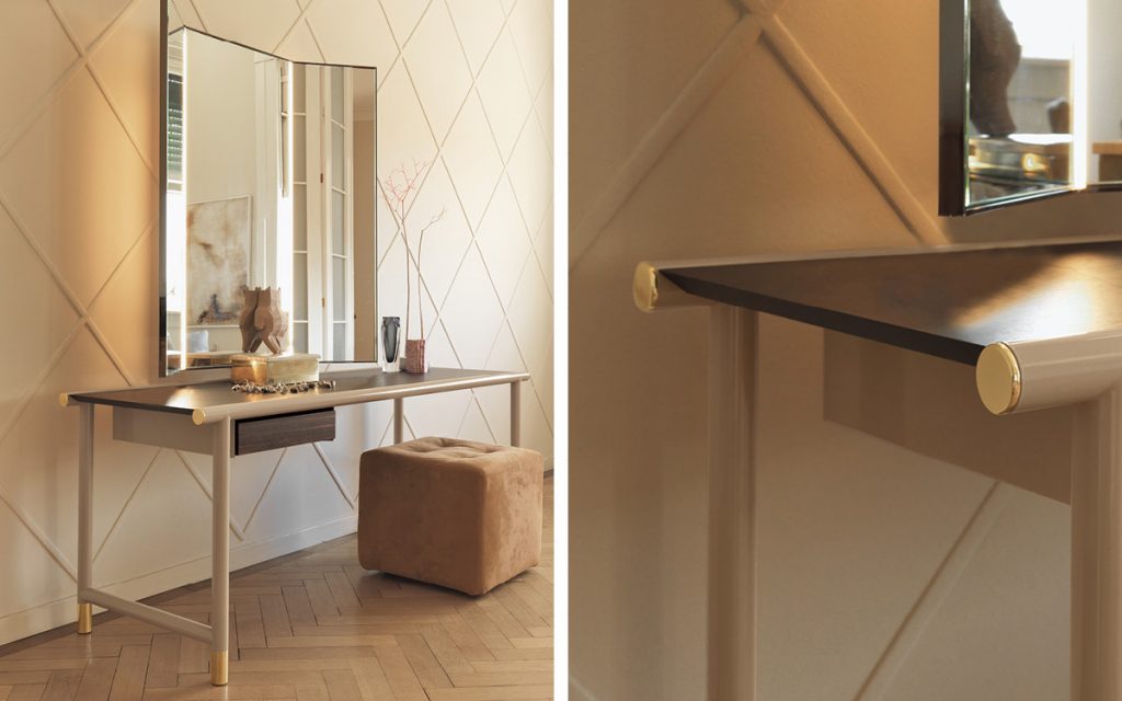 The steel structure of the console is available with a glossy beige or a matt burnished finish with details in glossy gold or in glossy black nickel.