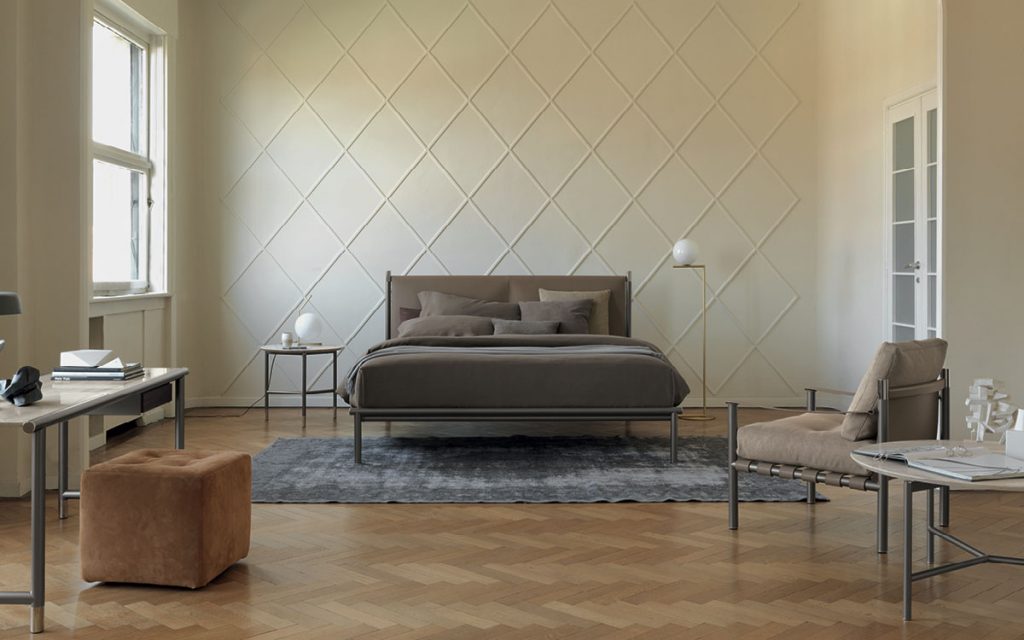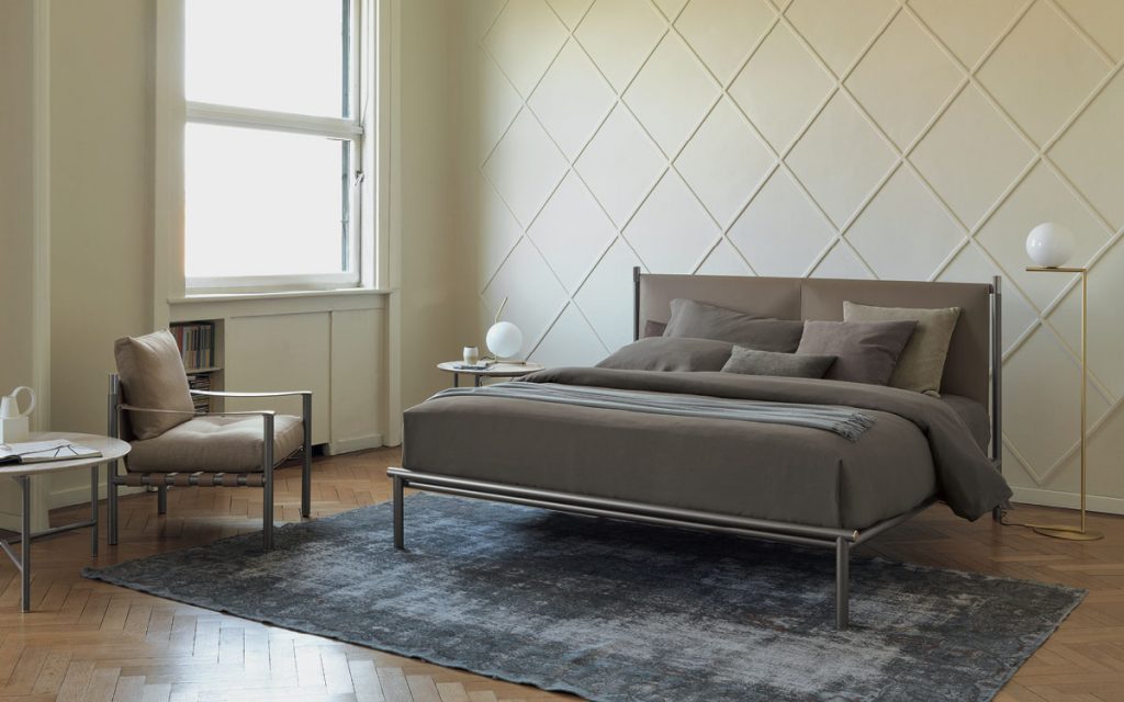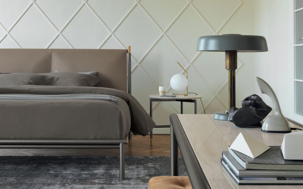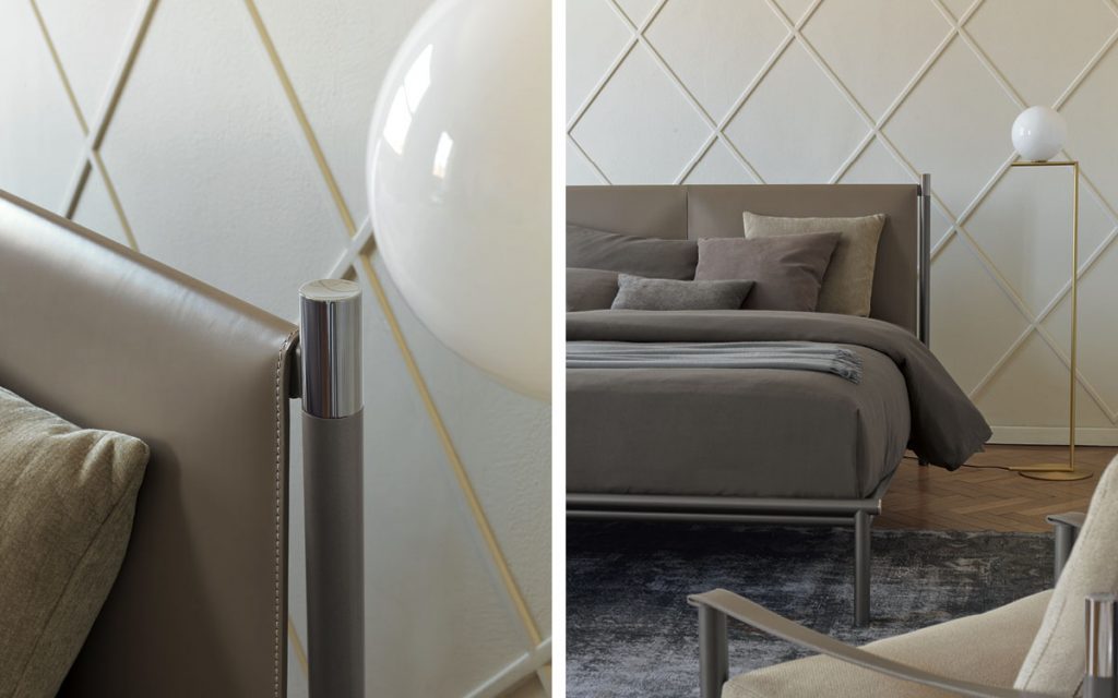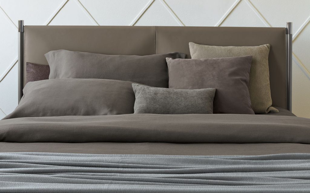 Elegance, exclusiveness and understated luxury are the key features of this double-size bed; its apparent simplicity is defined by the purity of the lines, the quality of the materials used and the elegance of the details. Demountable steel tube structure available in glossy beige or matt burnished finish. Details in glossy gold or glossy black nickel. Hide headboard cover available in the colours: natural, moka, black, burgundy, tobacco, sand, mud, nut brown, dove grey, ash grey and mastic grey.