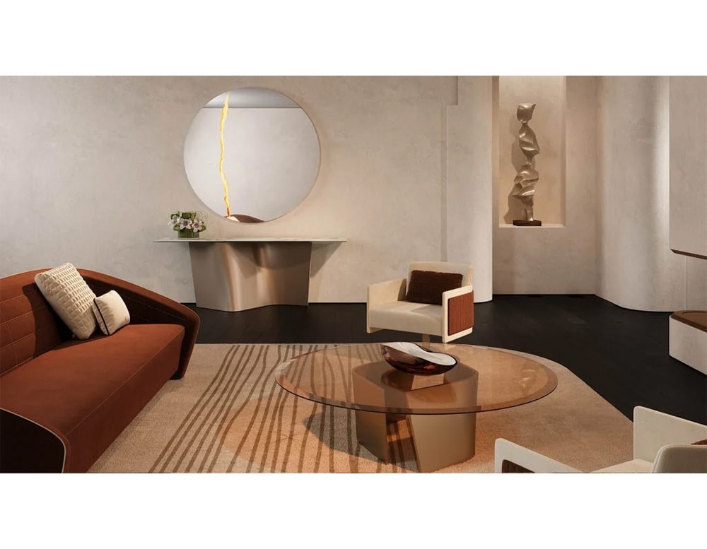 circular mirror made of clear glass with a gold brass finish decoration on a white background