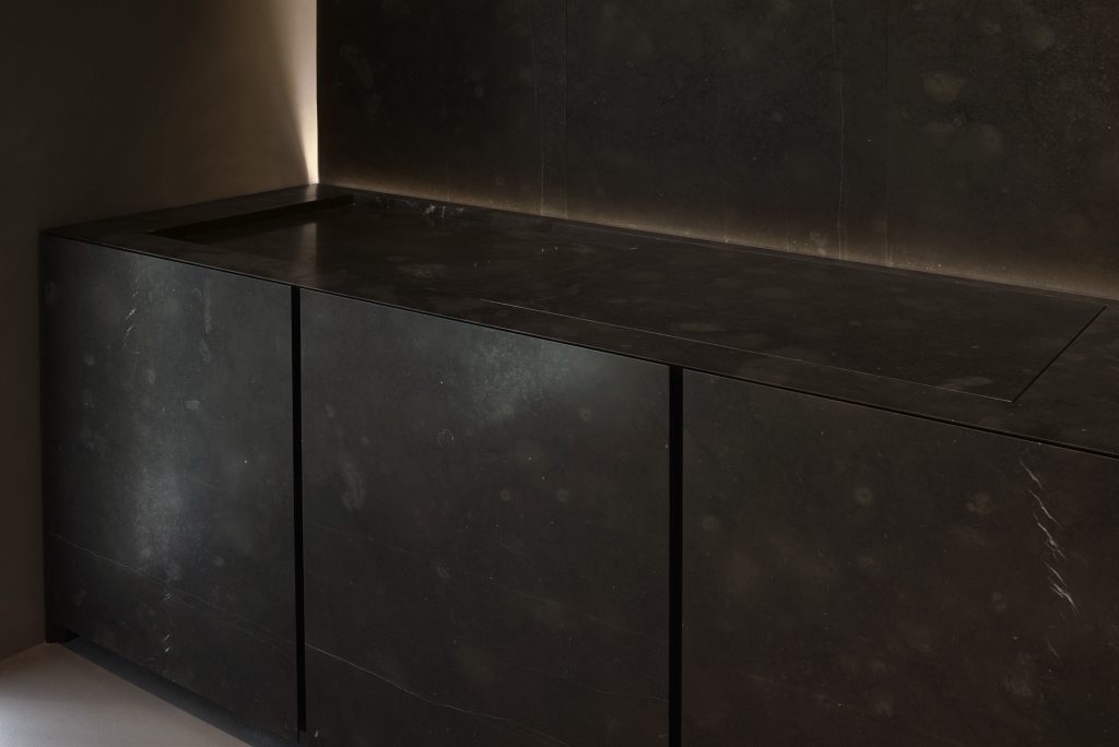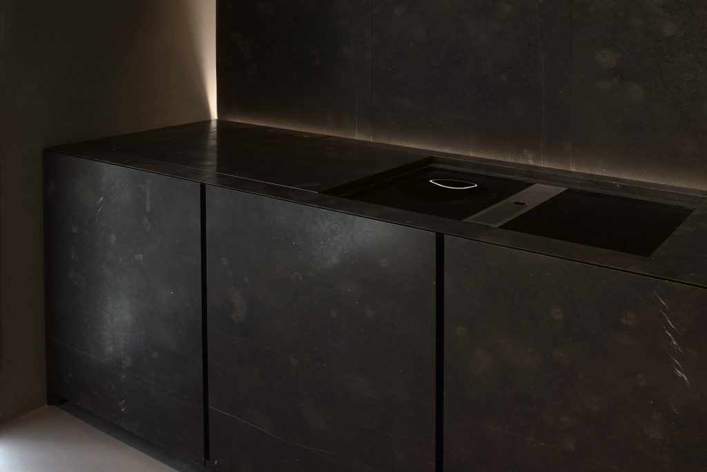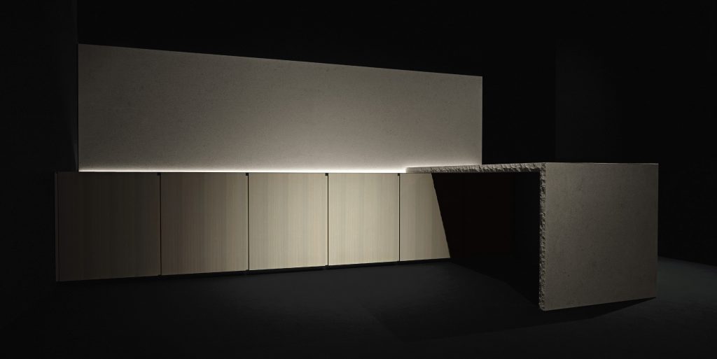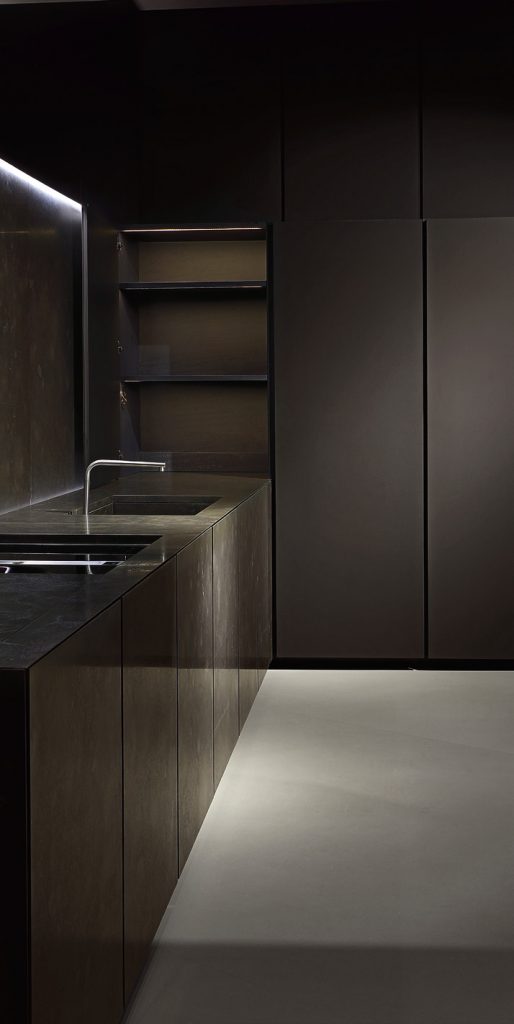 Inca has vertical profiles evoking a vertical rhythm and shaping the kitchen module. The worktop is hidden behind the doors so that a single perimetric line visually connects the different materials and finishes. The 45 degrees edge worktop and doors identifies the kitchen with a single volume. Tall units have the same vertical profiles. Inca is available in wood, high gloss or matt lacquer, with a stone worktop.