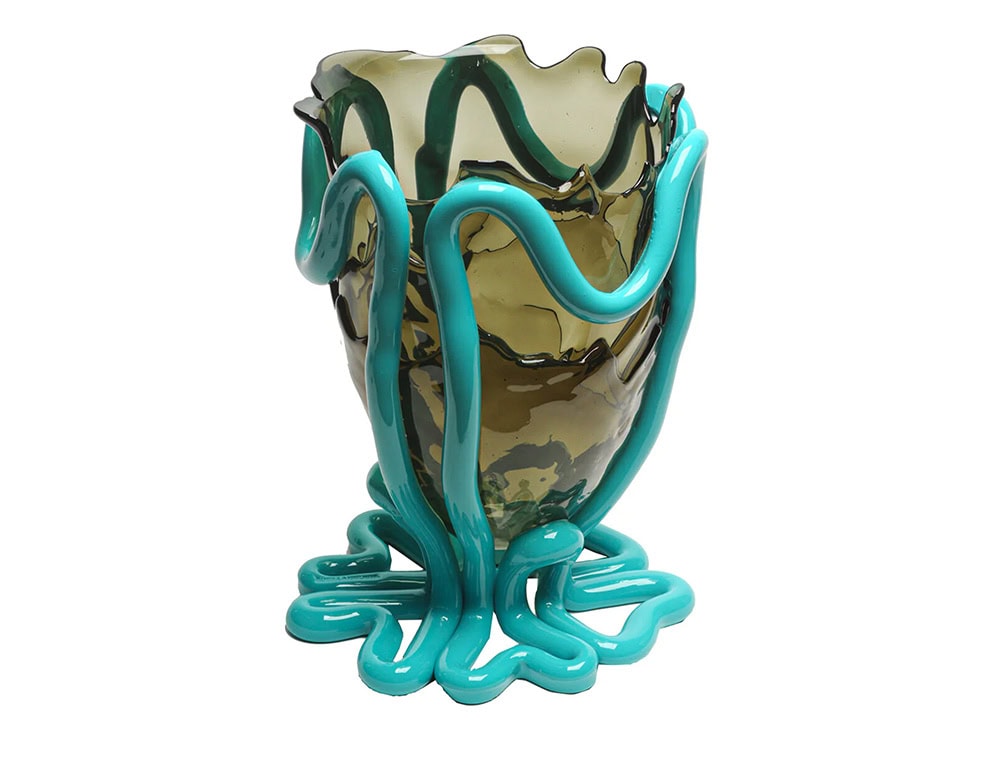 Soft resin vase in Clear Fume and Matt Turquoise color.