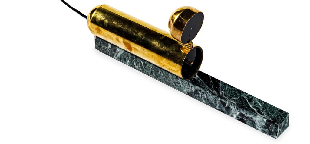 A table lamp inside a golden tube. Tube rest on a green marble slab. Tube opens illuminating an opaque glass bulb, bulb slides in and out to adjust the lighting.