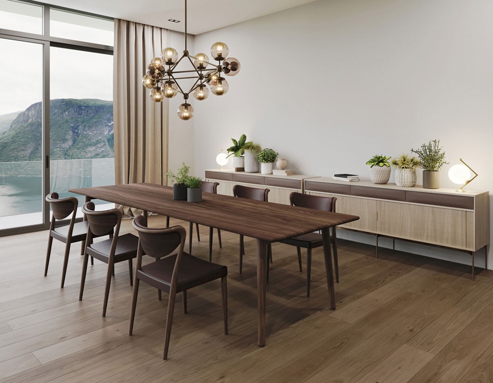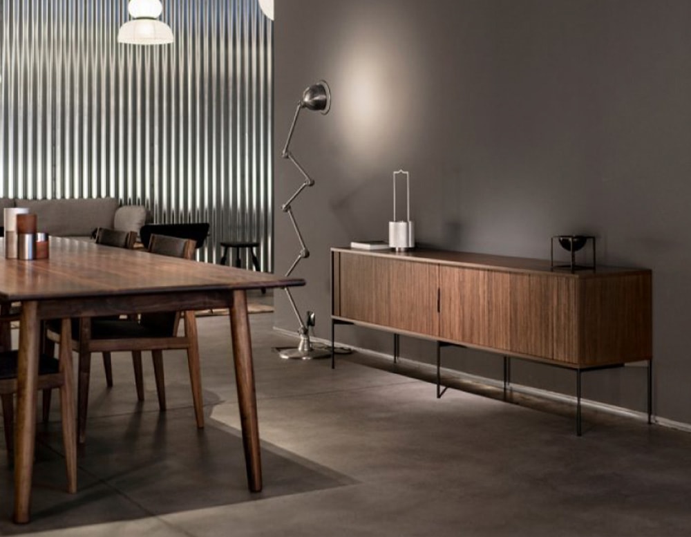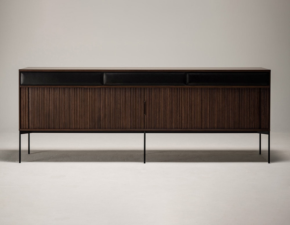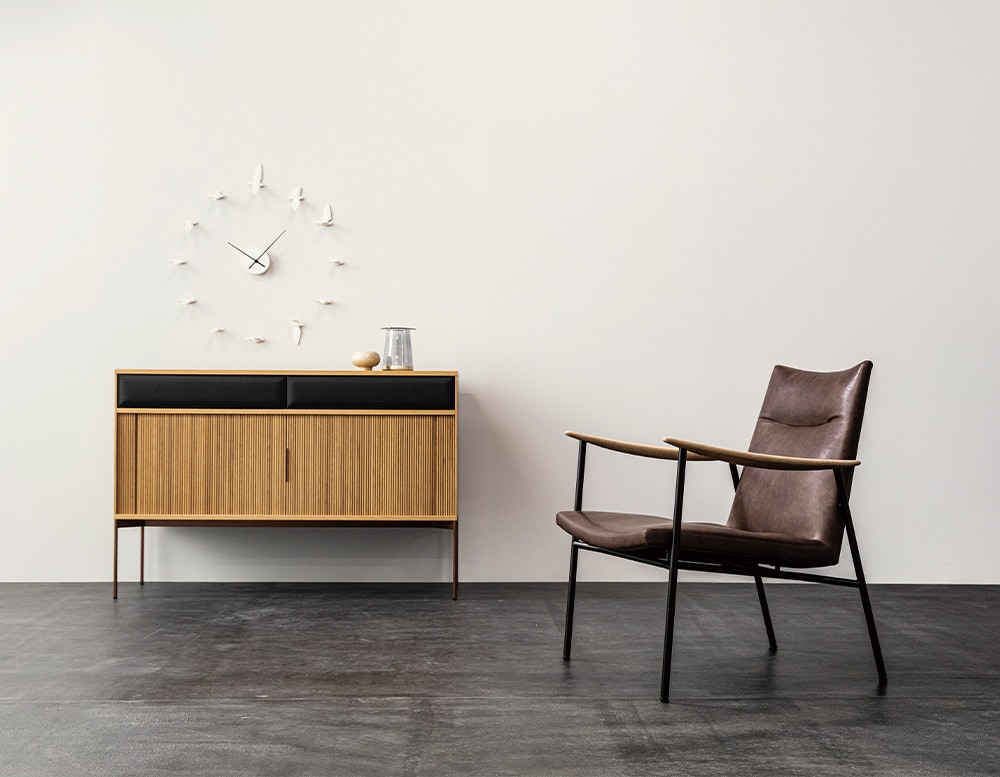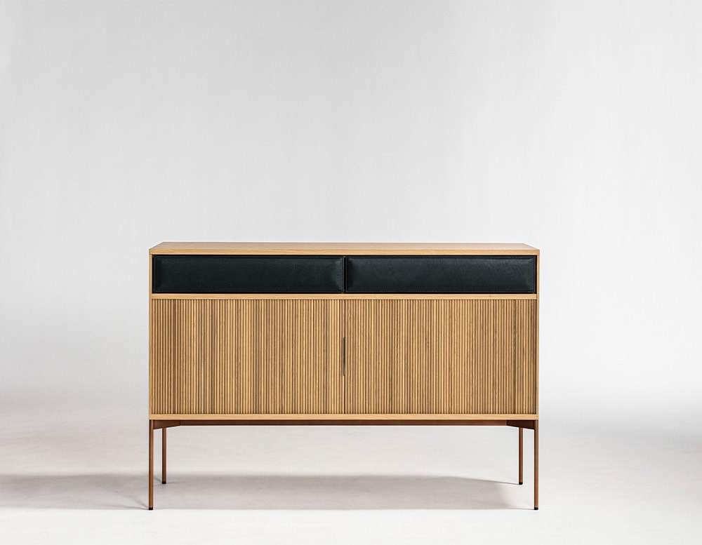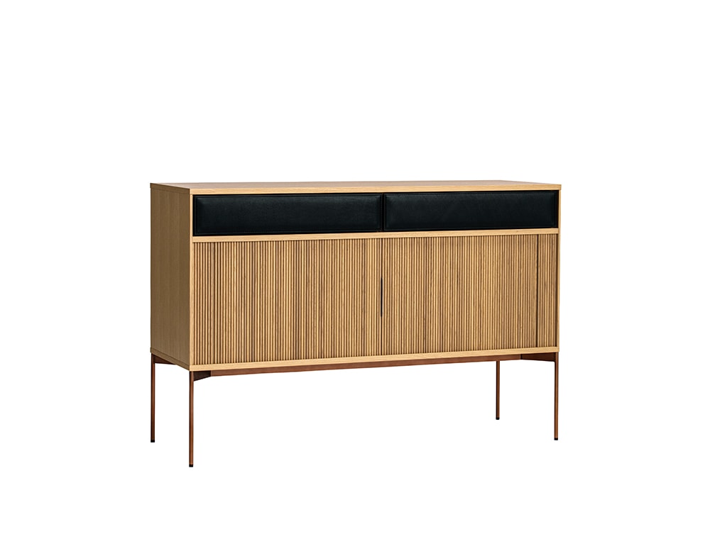 Jabara sideboard is characterized by its 'Jabara' door, a sliding tambour door whose classical design is refined to timeless and minimalist beauty. It looks modern but somehow exudes nostalgic warmth. The unique appearance of the door conjures up an image of beautiful and continuous fine lines particular to Japan, which are seen in reed screen doors of townhouses in summer, and a bamboo forest in Sagano, Kyoto. Strips cut out of selected natural wood, piece by piece, and their rounded surface create fantastic shades, which in turn accentuates its profound look. And its organic and dignified appearance brings excitement and comfort into a room. Thick leather is selected for the front panel of drawers because its smooth but firm texture makes it an ideal material that brings you comfort when your fingers touch it.