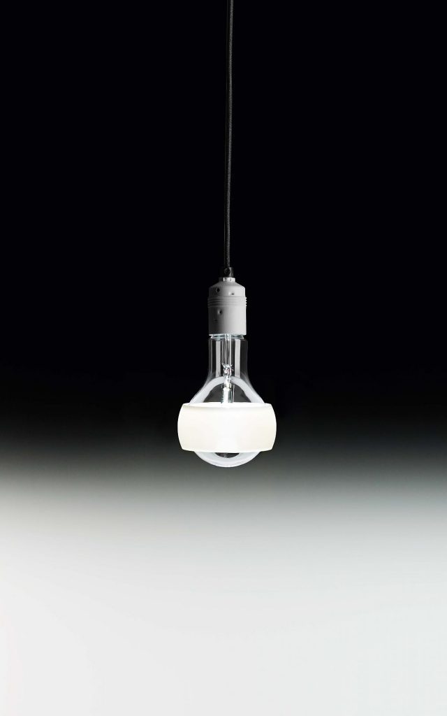 Hanging lamp with bulb in special shape Ø 10 cm and white heat-reasistent PTFE shade. Grey textile cable. Metal socket, lacquered white.