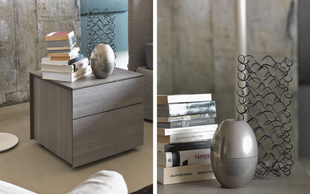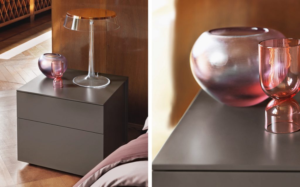 Series of furniture accessories consisting of chest-of-drawers, night table and tallboy with scratch-resistant surface (Style, Epoque or River) or matt lacquered (colours: white, sand, bronze, dark grey, rope beige, lead-grey).
