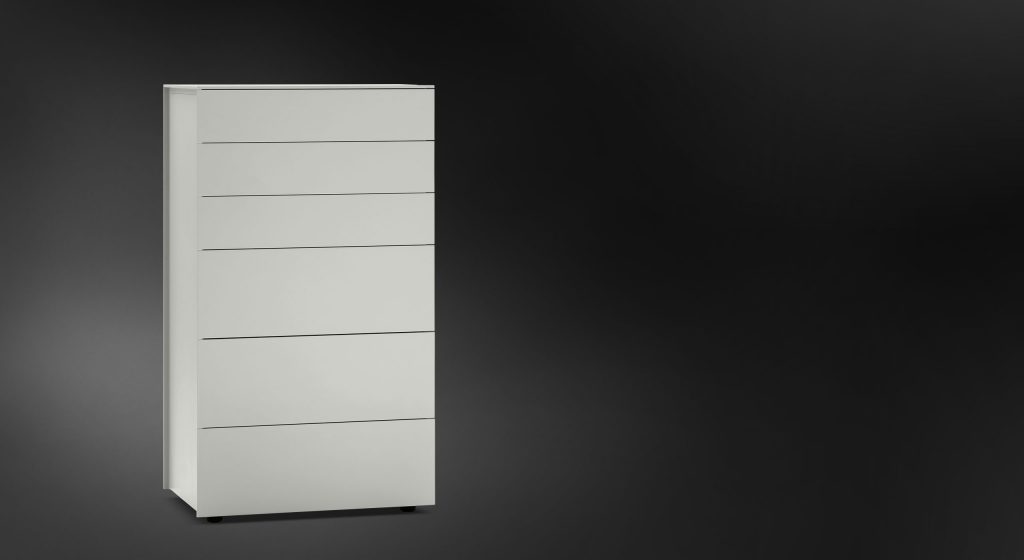 Series of furniture accessories consisting of chest-of-drawers, night table and tallboy with scratch-resistant surface (Style, Epoque or River) or matt lacquered (colours: white, sand, bronze, dark grey, rope beige, lead-grey).