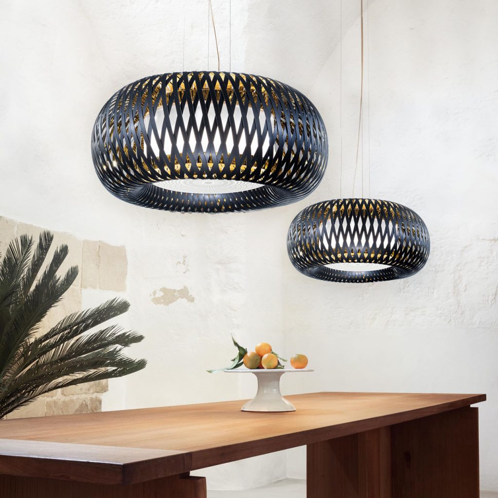 Inspired by the art of weaving, part of humanity from prehistoric times in the form of baskets and cane sacks, Kalatos revisits these archetypes with a modern take using Slamps advanced technopolymers; the collection has both suspension and ceiling versions. They come in two colour combinations: matte black with an internal gold finish, or white with transparent Lentiflex®.