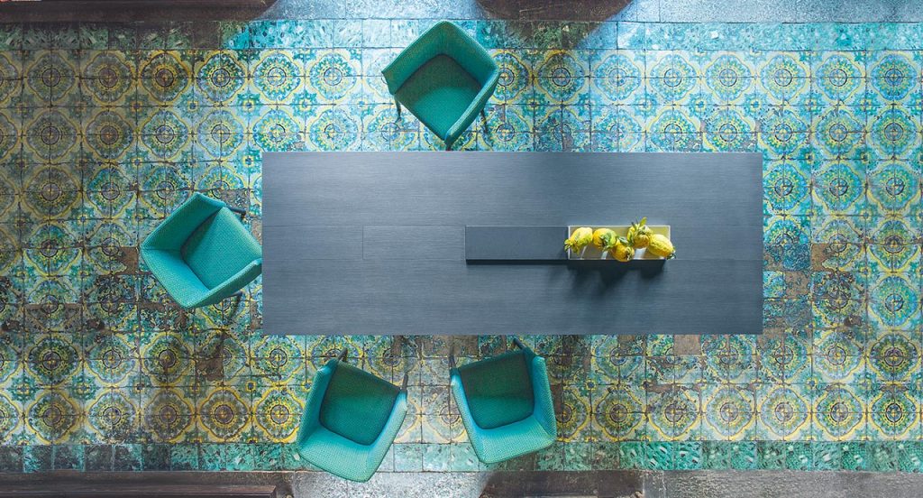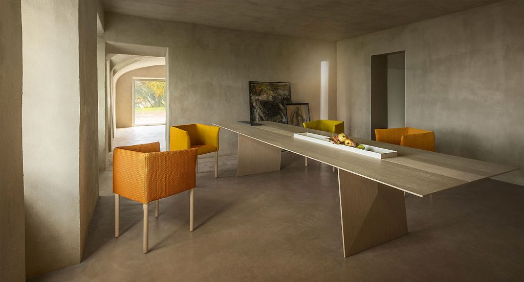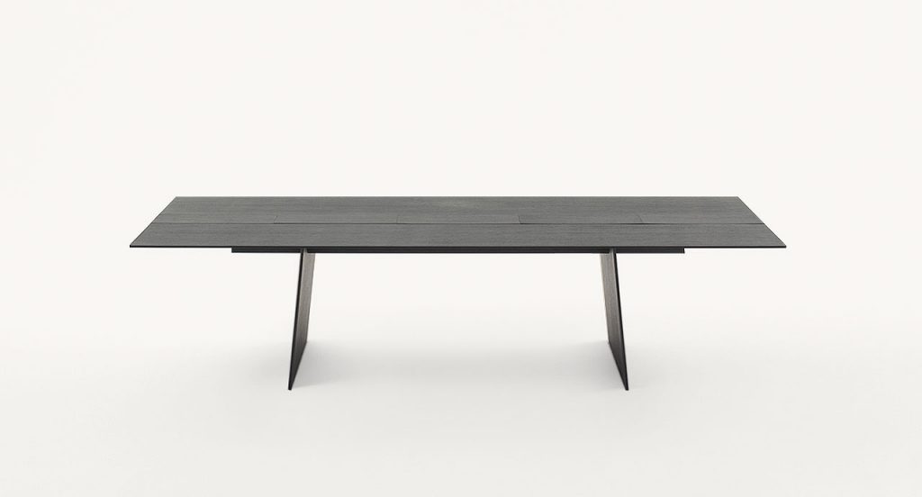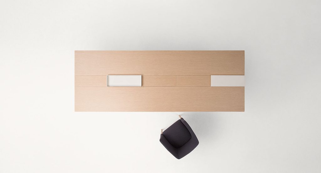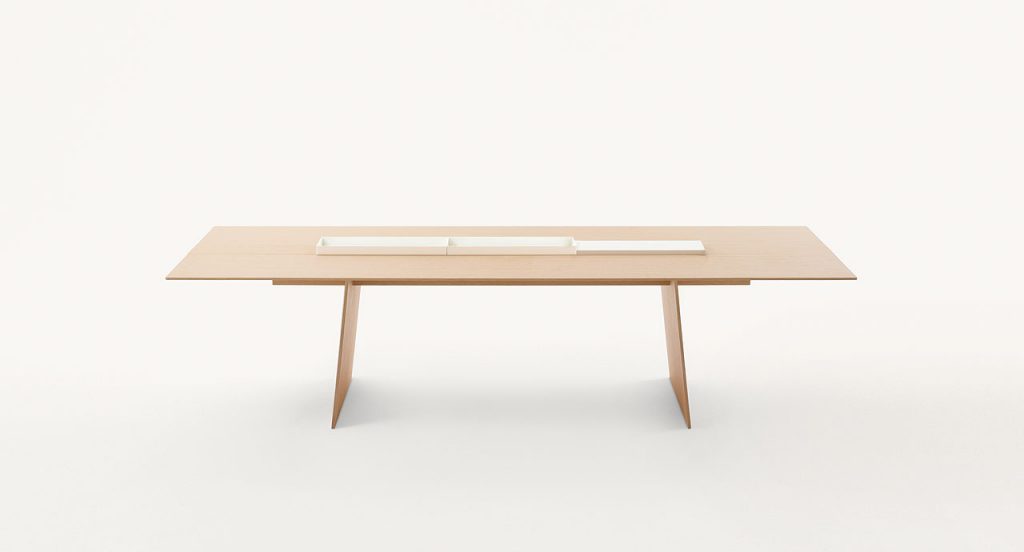 Dining table available in two different dimensions. The top features the central section divided into independent and removable elements. It is possible to replace the desired number of such elements with a cutting board, made of either stoneware or Luni marble, or with white gloss-varnished metal trays. The series Kanji includes also a side table available in the same finishings. - Top: fibreboard veneered and finished Mano Opaca. - Base: multilayer wood and fibreboard veneered and finished Mano Opaca. - Notes: The central part of the table is divided into section with 60 cm length each. It is possible to remove the desired number of sections and replace them with the available accessories. - The elements composing the central section, which are removed and replaced by the cutting board or the tray, can be stored in a specific compartment existing under the tabletop. - Trays and cutting board can be also used as accessories to be simply placed onto the table. - Awards: the Kanji dining table received the Special Mention of the GERMAN DESIGN AWARD 2016 in the Excellent Product Design category and won the RED DOT AWARD 2016 in the Product Design category.