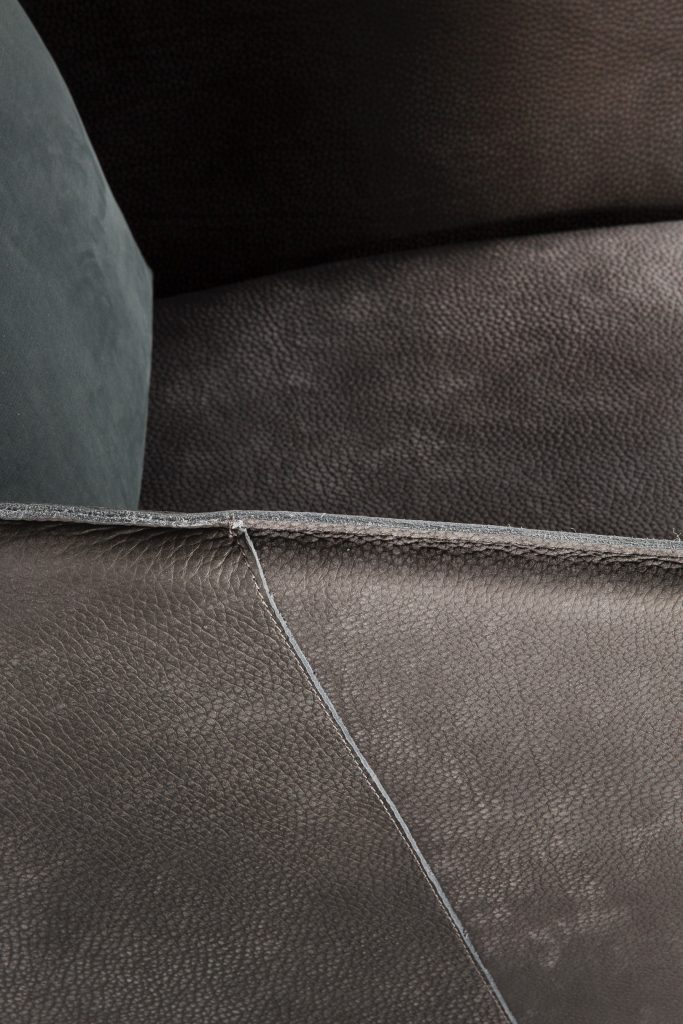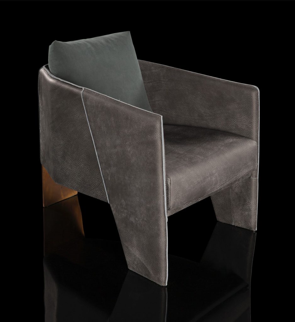Structure armchair with solidwood, back leg in burnished steel by hand using traditional techniques brass finish - finish padded seat, back and arms in leather finish from the samples in the range back cuschion in textile from the samples in the range