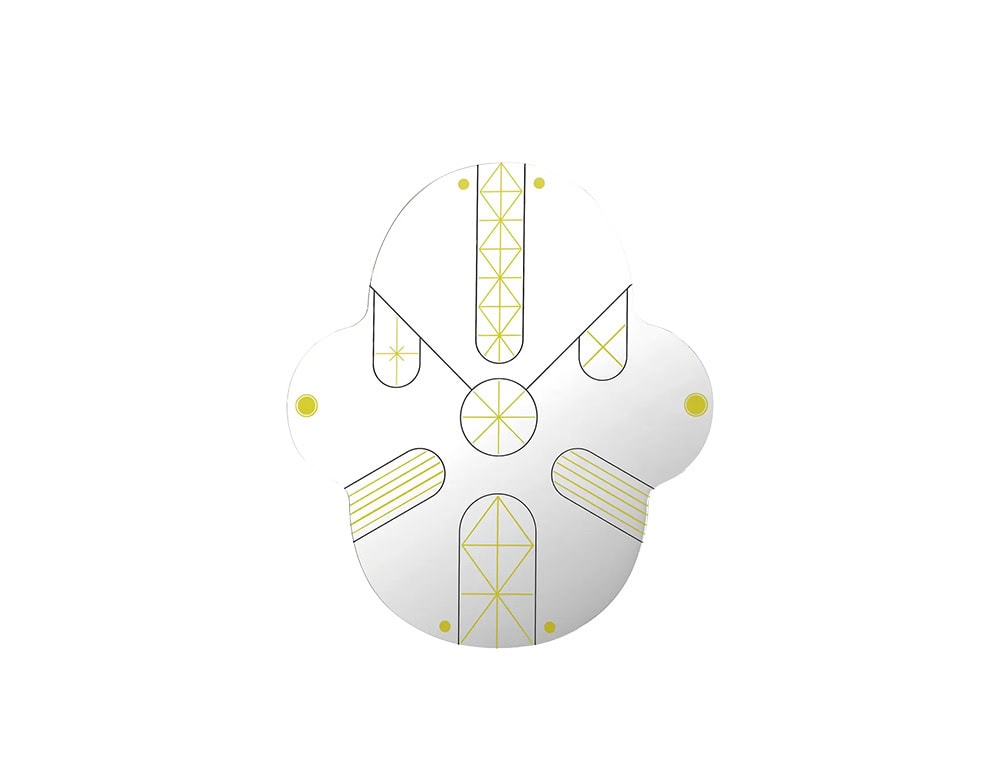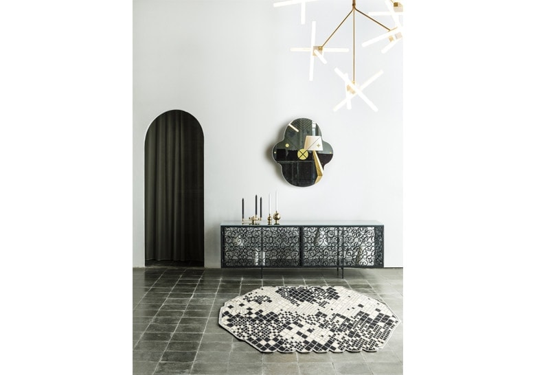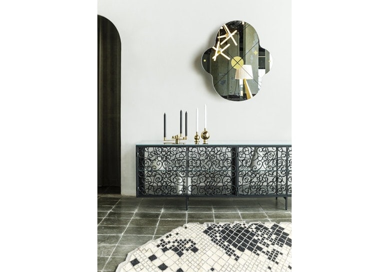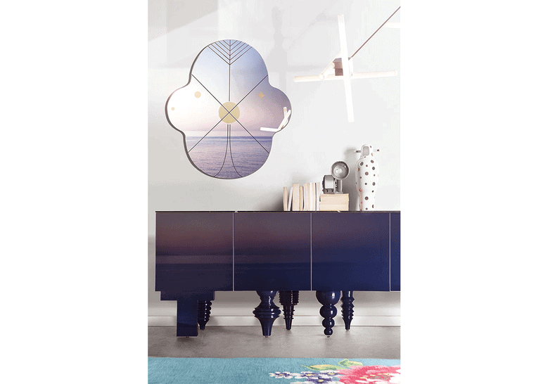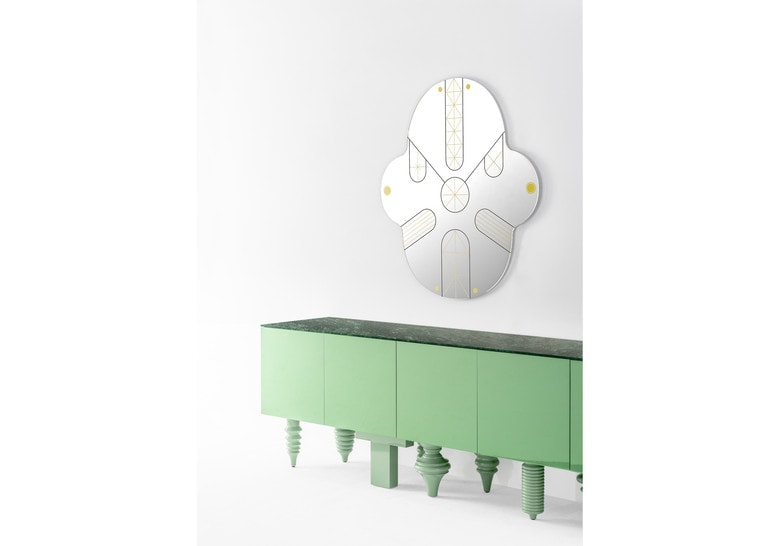 Jaime Hayon designed these two mirrors for BD. They represent two faces (King and Kong) and are available in two sizes. Gold and black geometric lines spread across the mirrors in symmetrical patterns. The silhouette of the mirrors is like that of a monkey’s face and can be placed alongside each other or individually.