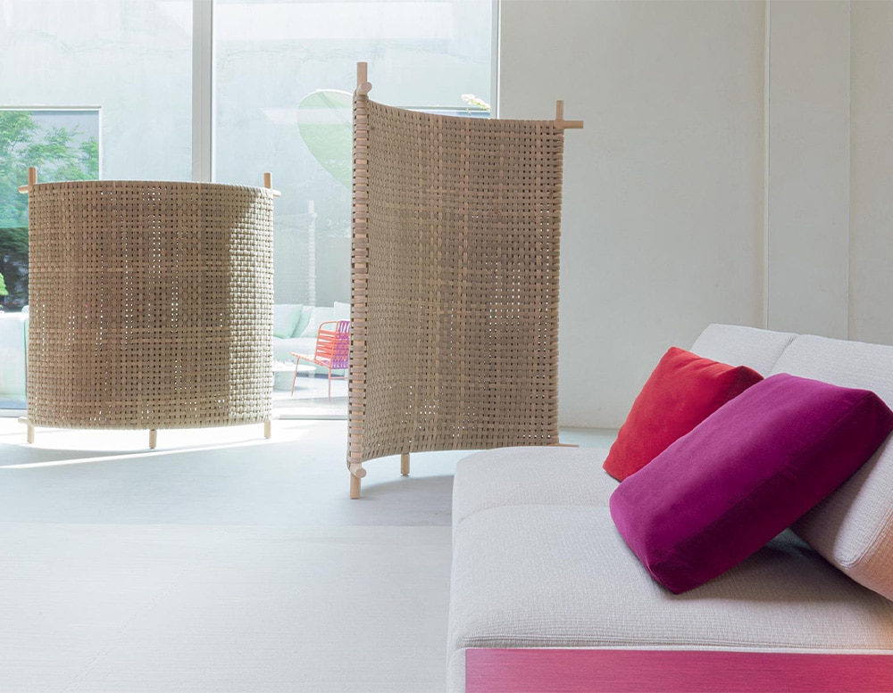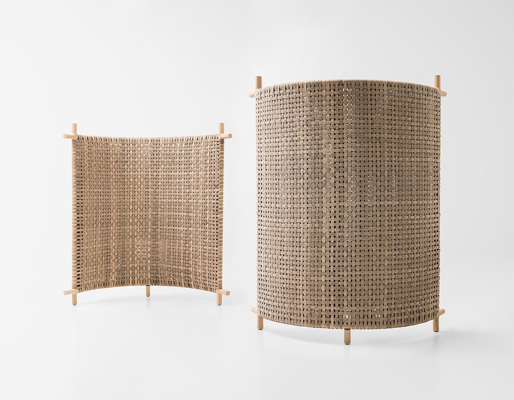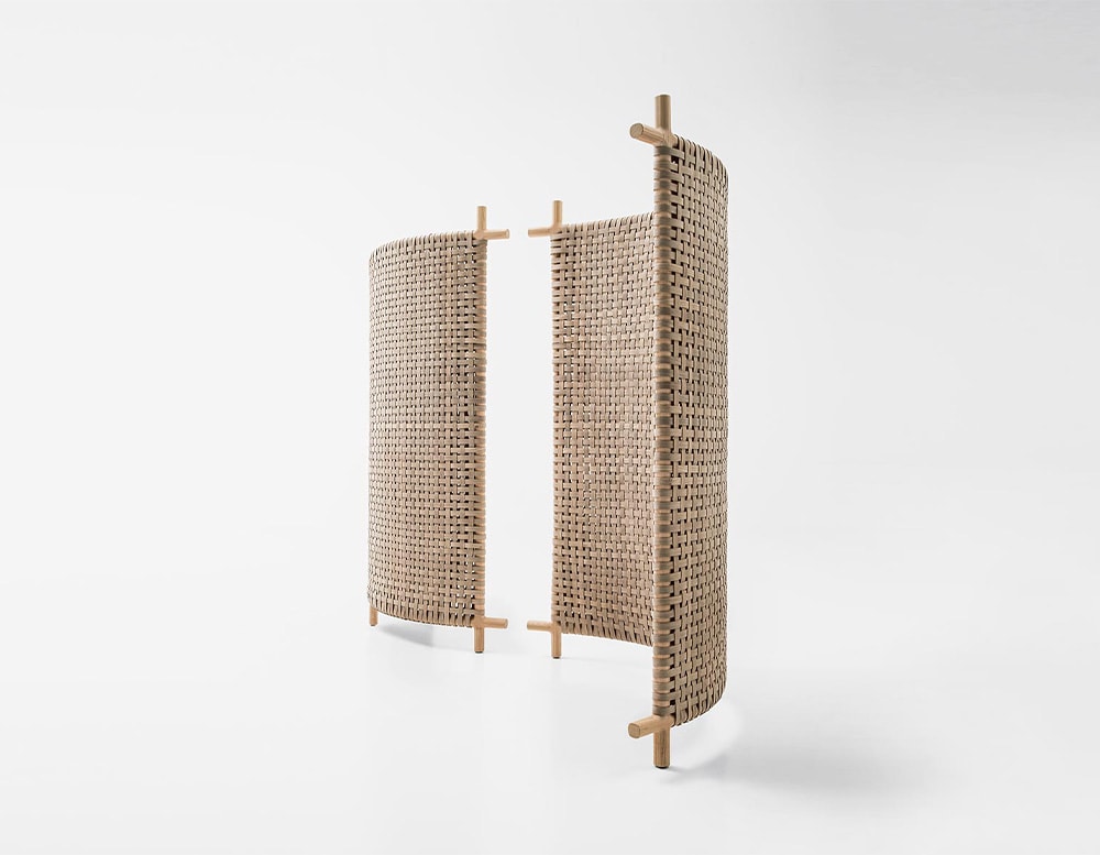 Screen available in two heights. The Kiori series also includes an armchair and two- and three-seater sofa. Structure: natural sassafras heartwood, plastic spacers. Upholstery: fixed, woven by hand with Conwood, strips of ash wood Abonos™ coupled with a cork support that makes them elastic yet resistant. Notes: Conwood is a Paola Lenti’s exclusive material that is produced in a thickness suitable to allow the manual weaving of Kiori seating and screens. This material guarantees good mechanical resistance but, if subjected to anomalous and repetitive stress, can crack or split, compromising this way not only the aesthetic appearance of the product, but also its functionality. Traction, excessive pressure and torsion movements, especially if performed on the individual strips, are to be absolutely avoided in order to prevent damages that could be irreversible and unrepairable. The sassafras wood and the strips of ash wood Abonos™ are treated to be water and oil-repellent with waterbased products that limit the absorption of liquids and greasy substances. Abonos™ is a wood of fluvial origin characterized by a thousand-year permanence in the water, where it was transformed through the action of sediments such as gravel, sand and clay. The series of chemical mutations, to which it has been subjected by nature has made each trunk a unique piece, in colour and design, without this affecting its structural qualities of hardness and resistance. This product can be used also in interior environments. We advise to use a Winter Set protection cover.