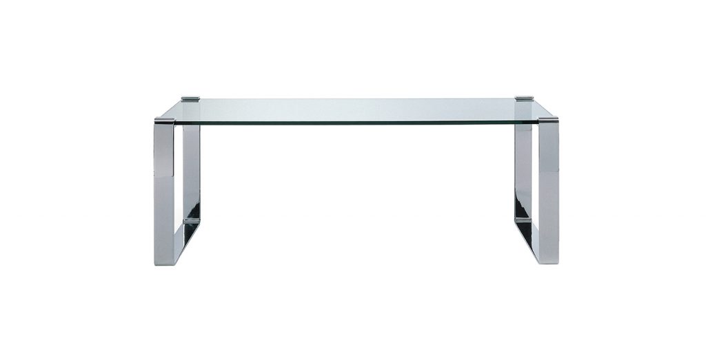 A set of three tables, side table, coffee table, dining table and desk with a glass plate and skids made of steel in polished chrome, matt chrome or matt nickel.