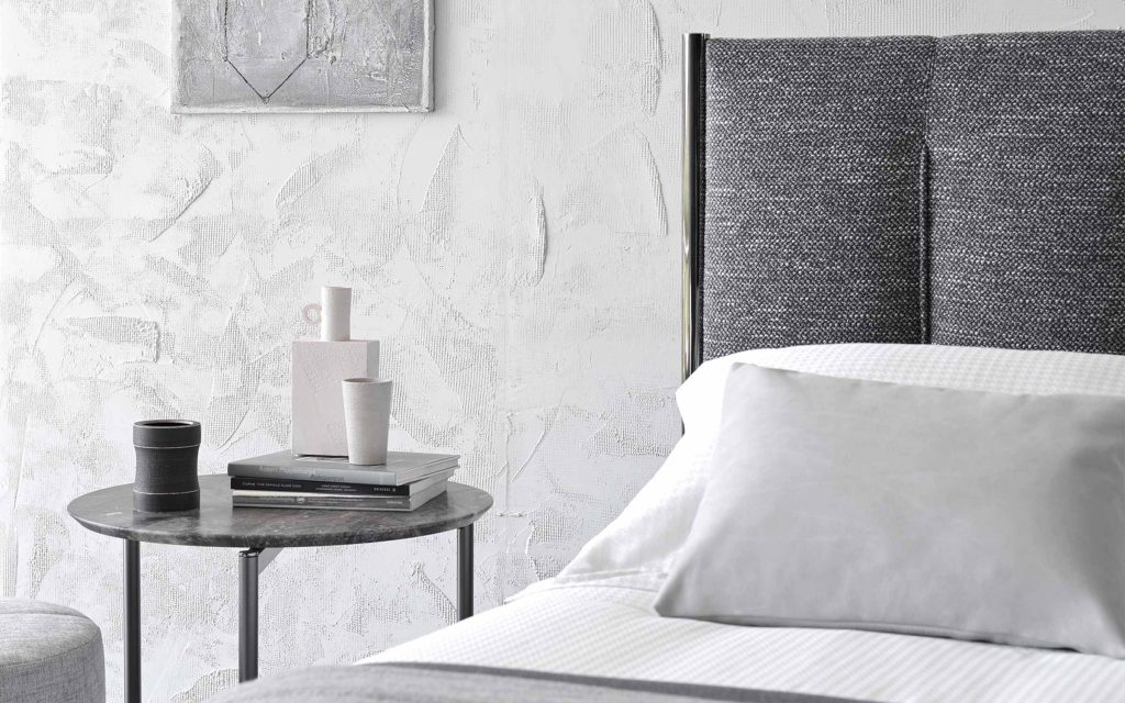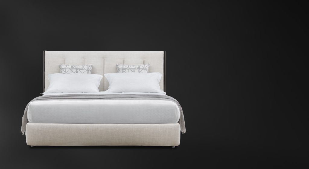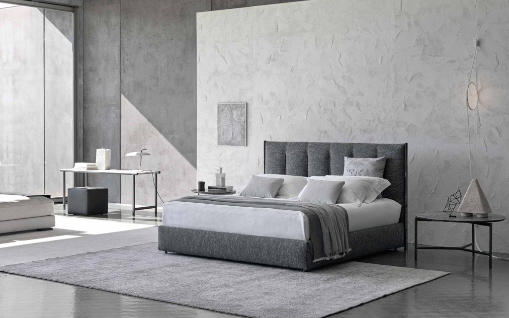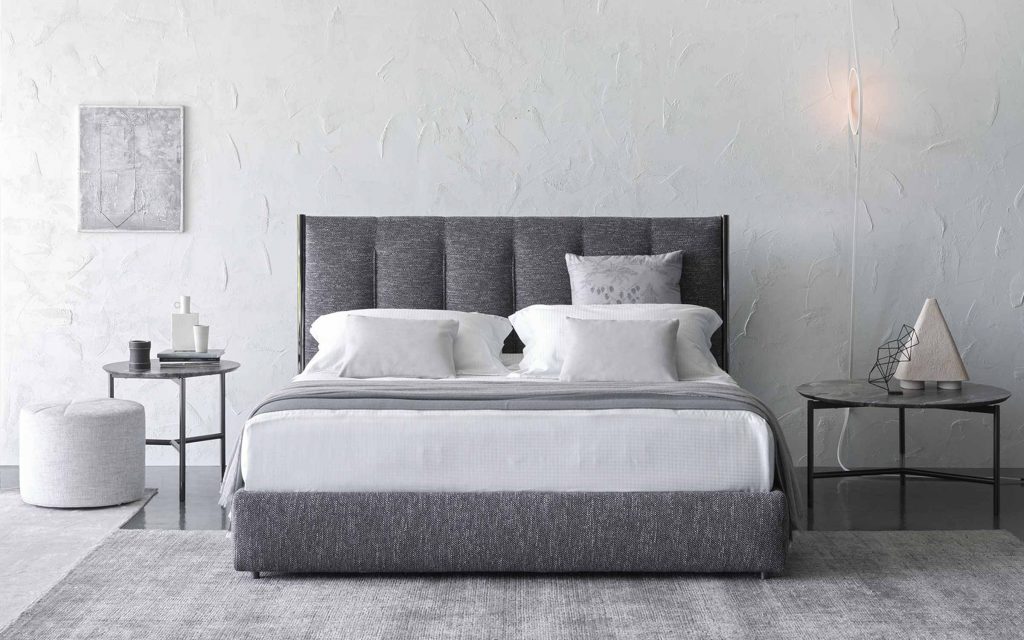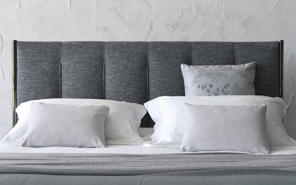 A double-size bed with clean, sharp lines; it immediately suggests the idea of discreetly charming, and not ostentatious, luxury. The original and architectonic shape of the headboard, framed by the eye-catching metal structure that continues downwards to form the feet, is softened by the fabric that has been skilfully stitched with vertical quilting. This decorative addition appears to elongate the bed and contributes to the creation of a design that is welcoming and sophisticated.