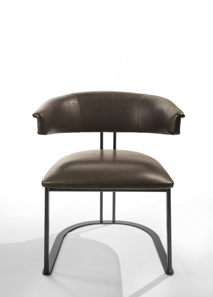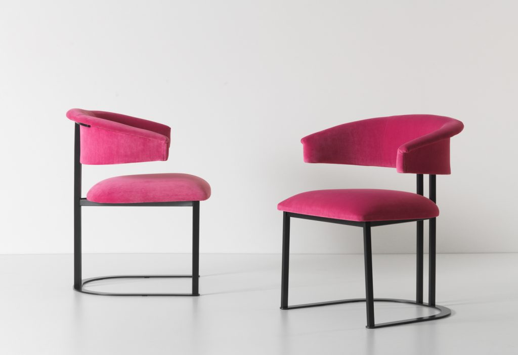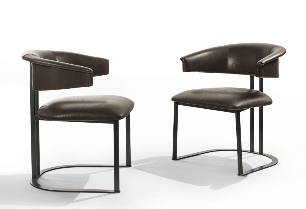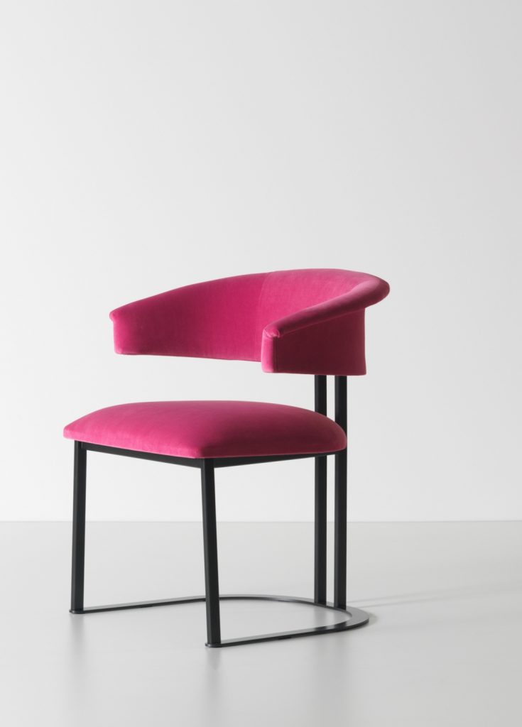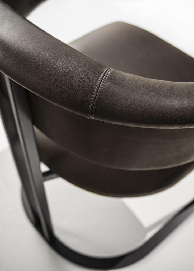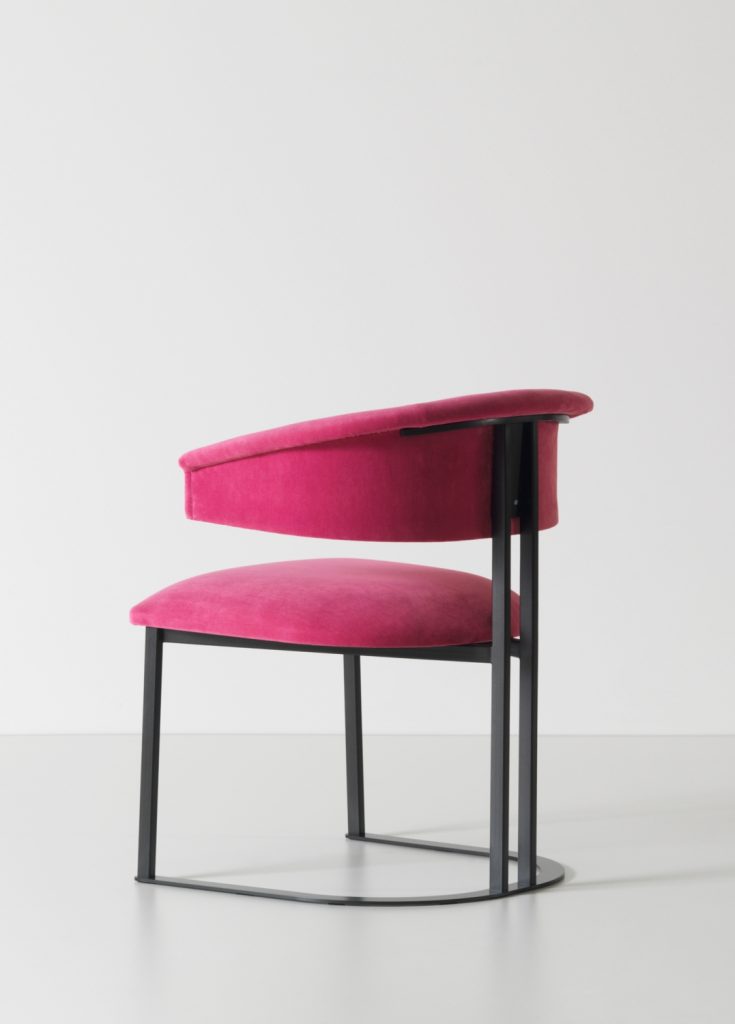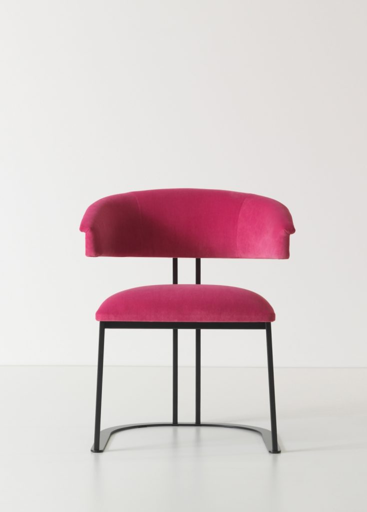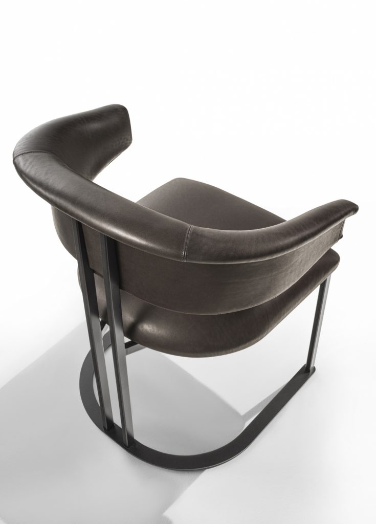 Kyo is a small armchair that interprets the design's history in an original way. Curved and embracing forms match with a structure consisting of iron elements with a brushed antiqued brass effect. The distinctive horseshoe-shaped base supports a series of thin metal profiles, joined to the soft and embracing padding of the seat and backrest. The result is an elegant, essential and timeless chair.