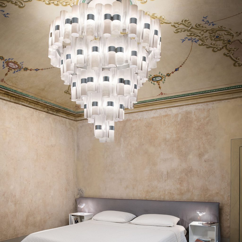 La Lollo and La Lollona are a tribute to the roaring 50s, evoking images of divas and flashbulbs. Sophisticated gradient chromatics, metallization, lace patterns and geometric designs that adorn varying spaces with the same versatility as jewelry on a womans body. The La Lollona 5 is 130 cm. in diameter with 132 of Slamps unique technopolymer cylinders. It arrives in superflat packaging weighing only 30 kg; easy to install, extraordinary to admire!
