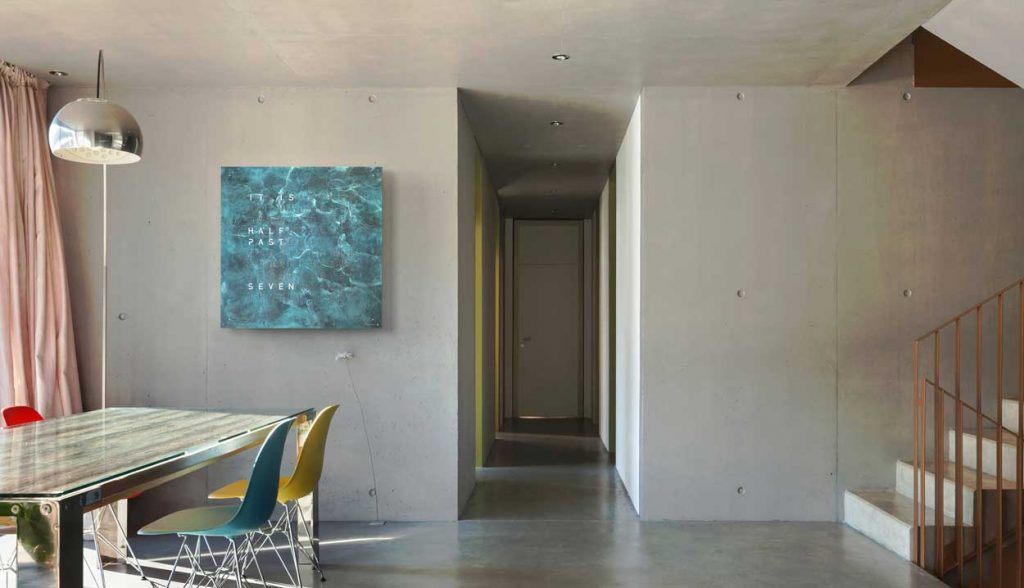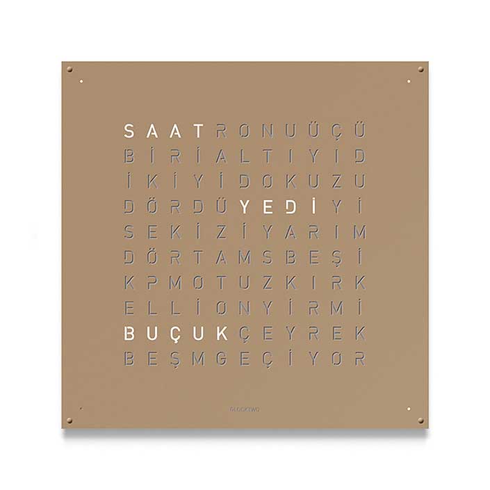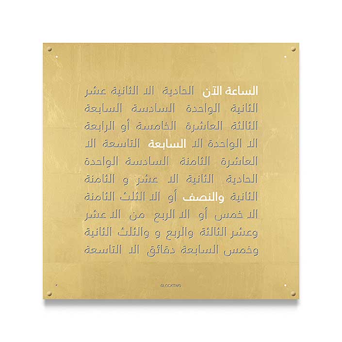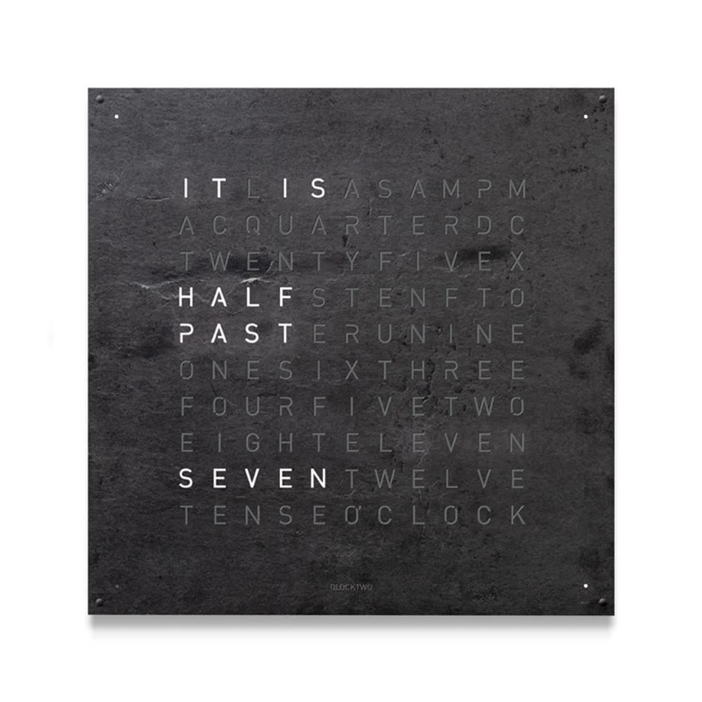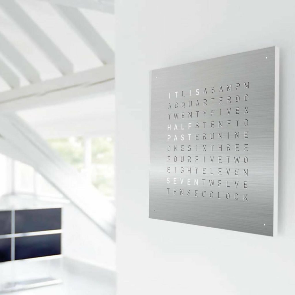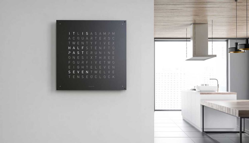 QLOCKTWO LARGE features an impressive front cover in a 90 × 90 cm format. It is available in various surface finishes and more than 20 languages. Its striking form gives every room a modern sense of time.