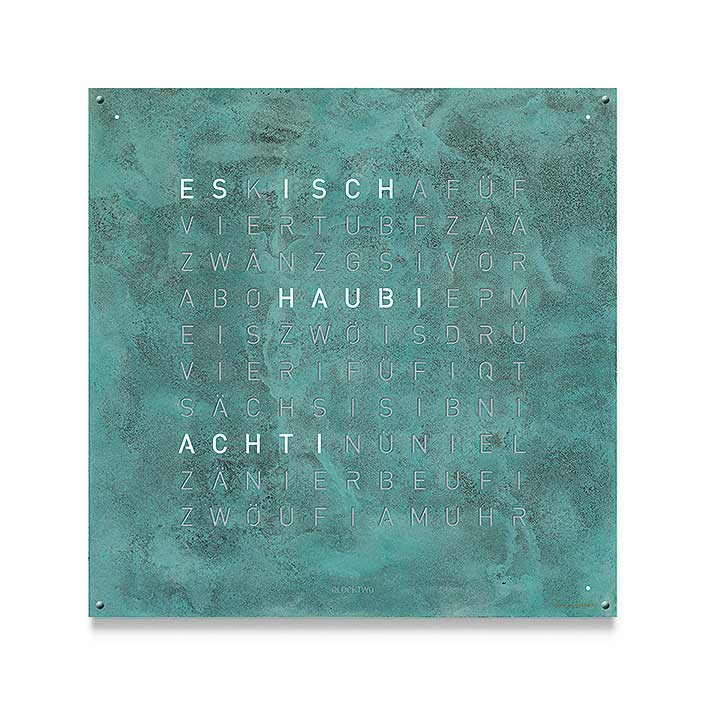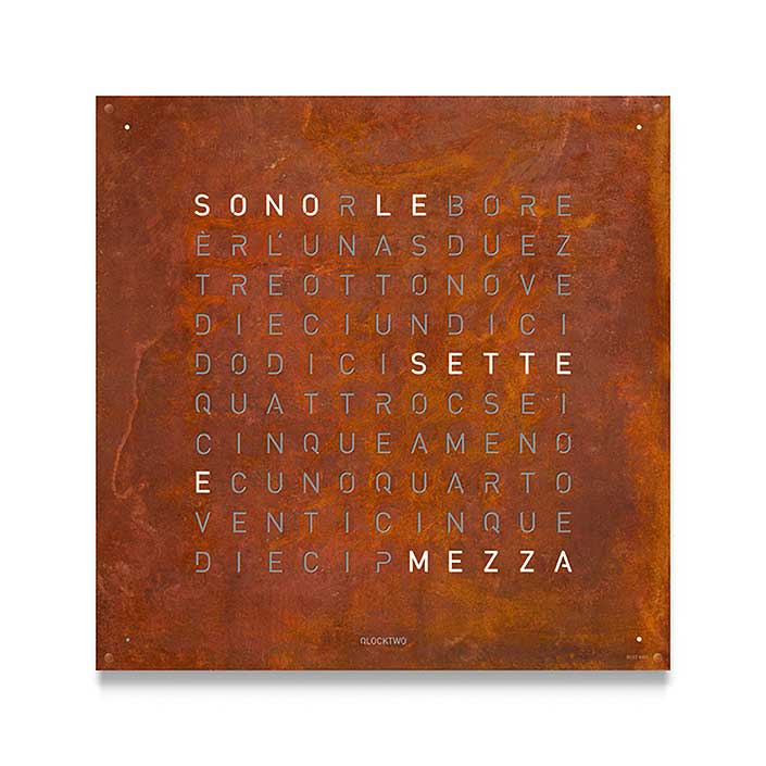 QLOCKTWO LARGE CREATORS EDITION models in RUST, VINTAGE COPPER, RAW IRON, GOLD, SILVER & GOLD and METAMORPHITE, metal brushed or matt powder coated stainless steel fronts.