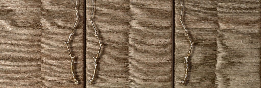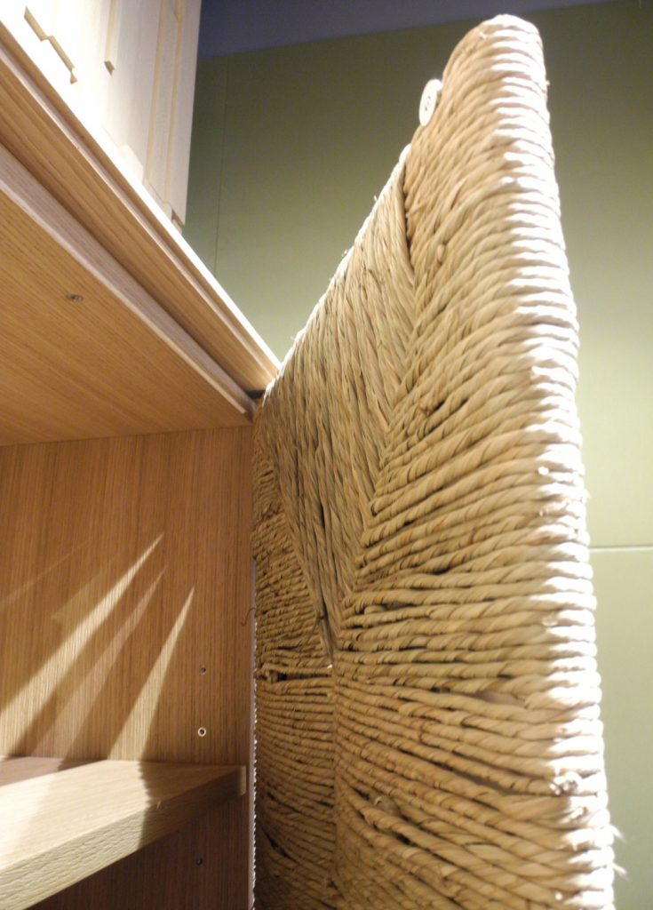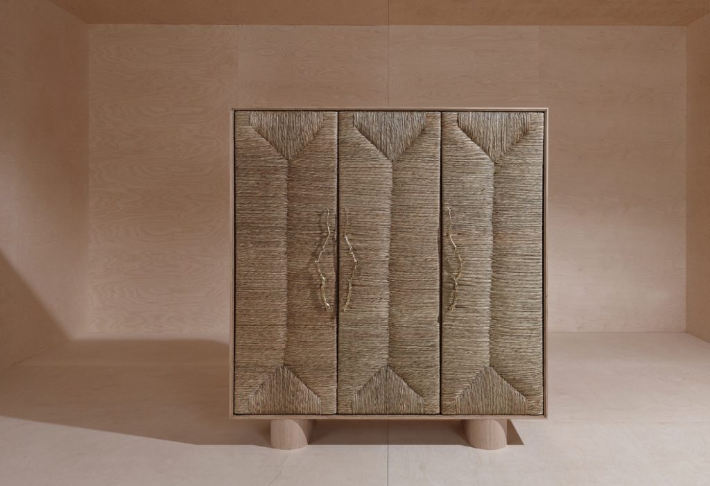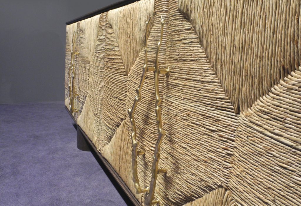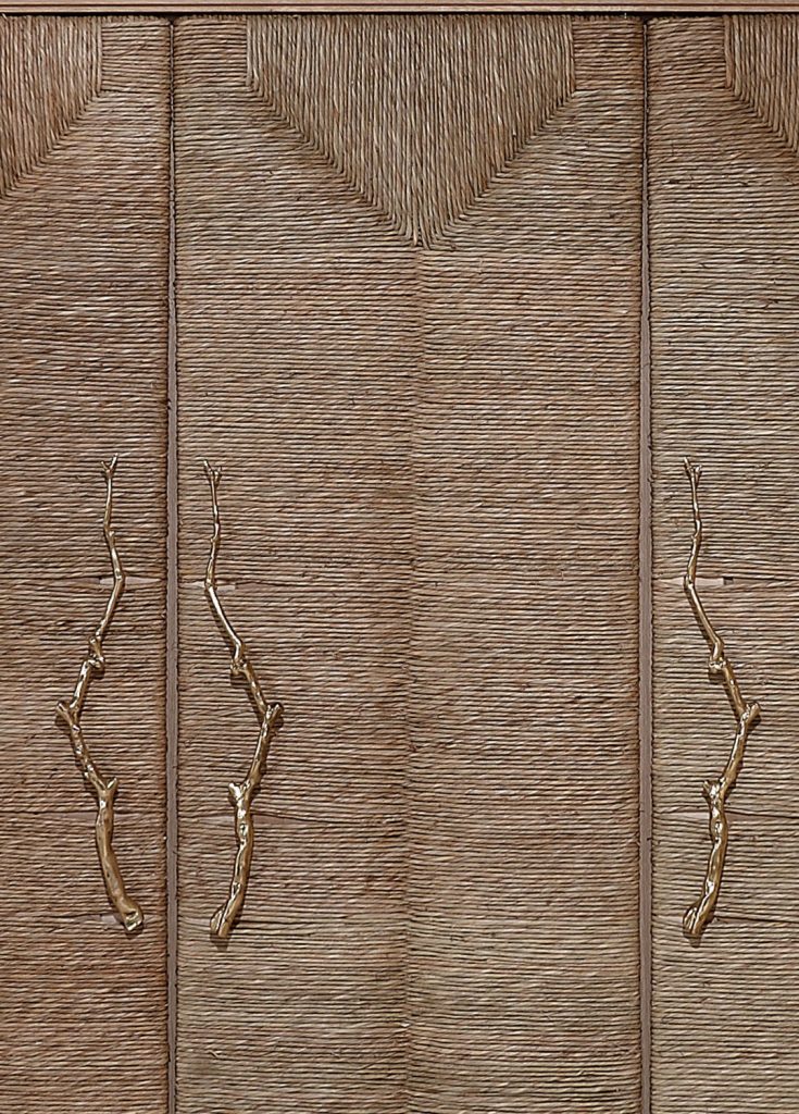 Storage units made of veneered panels, characterized by having doors with a framework in solid wood covered with straw. Handles in polished brass cast with a branch shape. Base in veneered multilayer wood. Inner spaces equipped with shelves in the same veneer of the structure.