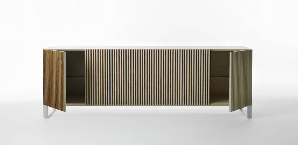 Leon plays with an awe-provoking optical effect that underlies its salient feature, that is, a standpoint-dependent visualization. From the front, the doors appear marked by vertical multi-coloured stripes yet, when observed from the side, dark or light uniformity prevails.
