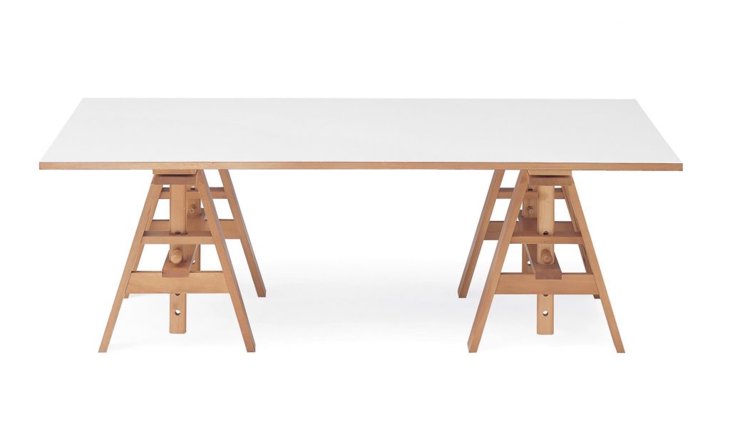 Natural varnished steam- treated beech trestle. Top coated with white plastic laminate, or with tempered plate glass. Adjustable height.