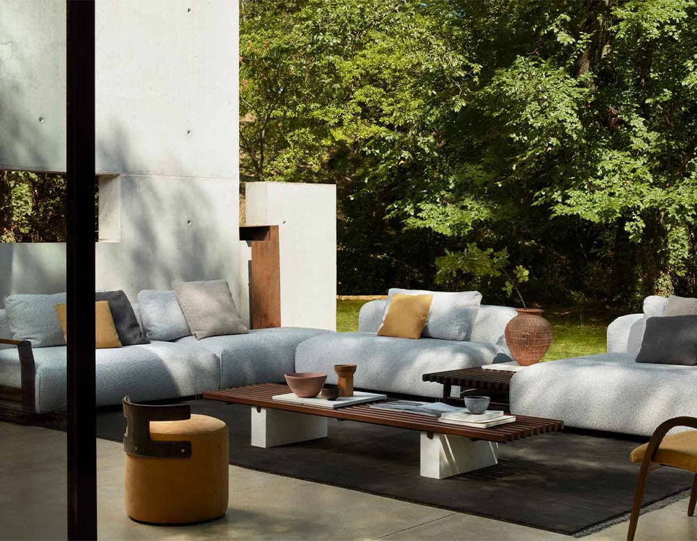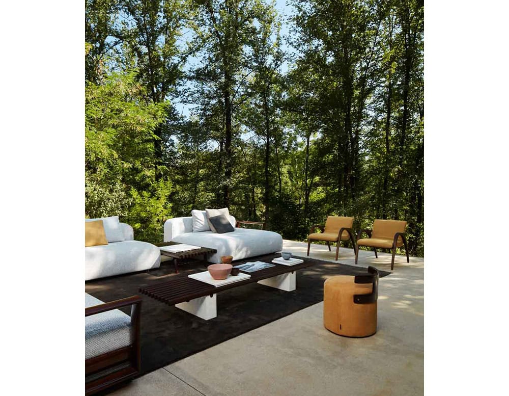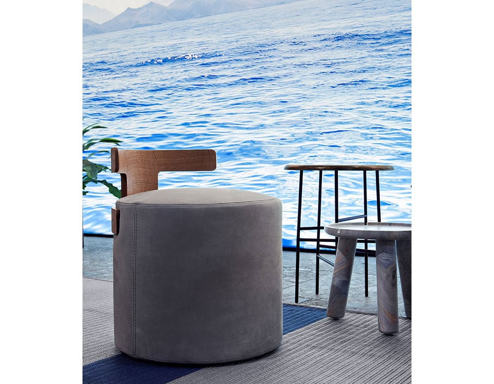 Single seat outdoor pouf with stainless steel structure and comfort polyurethane foam padding. The comfortable seats and the upholstered parts finishes are available in outdoor fabric and outdoor leather.