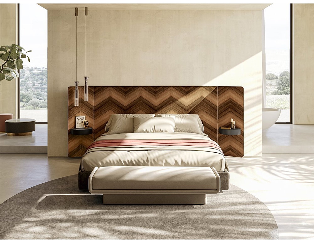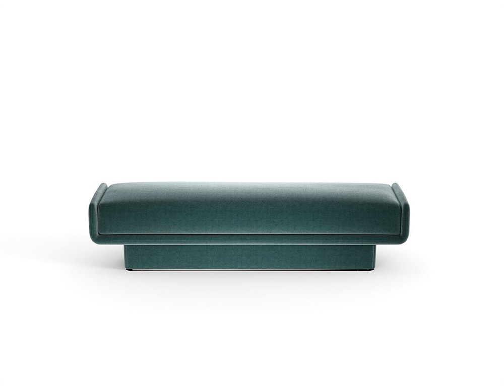 Bench in non-deformable polyurethane foam in different density and polyester fibre. Black lacquered metal base plate. Available with removable cover in fabric or leather as per samples. Fango lacquered metal side table on request. Additional stitching is required for elements with leather upholstery compared to elements with fabric upholstery.