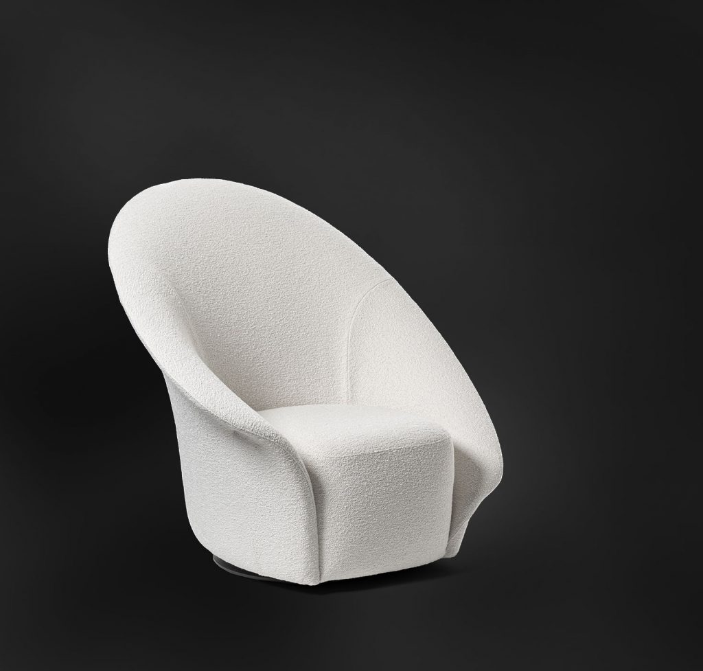 Lilia is a swivel armchair (360°), with a soft, functional shape which seems to have originated naturally from a flower that has just blossomed. The backrest softly envelopes the seat, and the asymmetry of the two armrests gives the design an original and contemporary touch. A project that gives hints of stylish design thanks to the cover, which is available in a range of fabrics and leathers with the option of choosing two colours: one for the external part of the backrest, and another for the internal part of the armchair and for the seat.