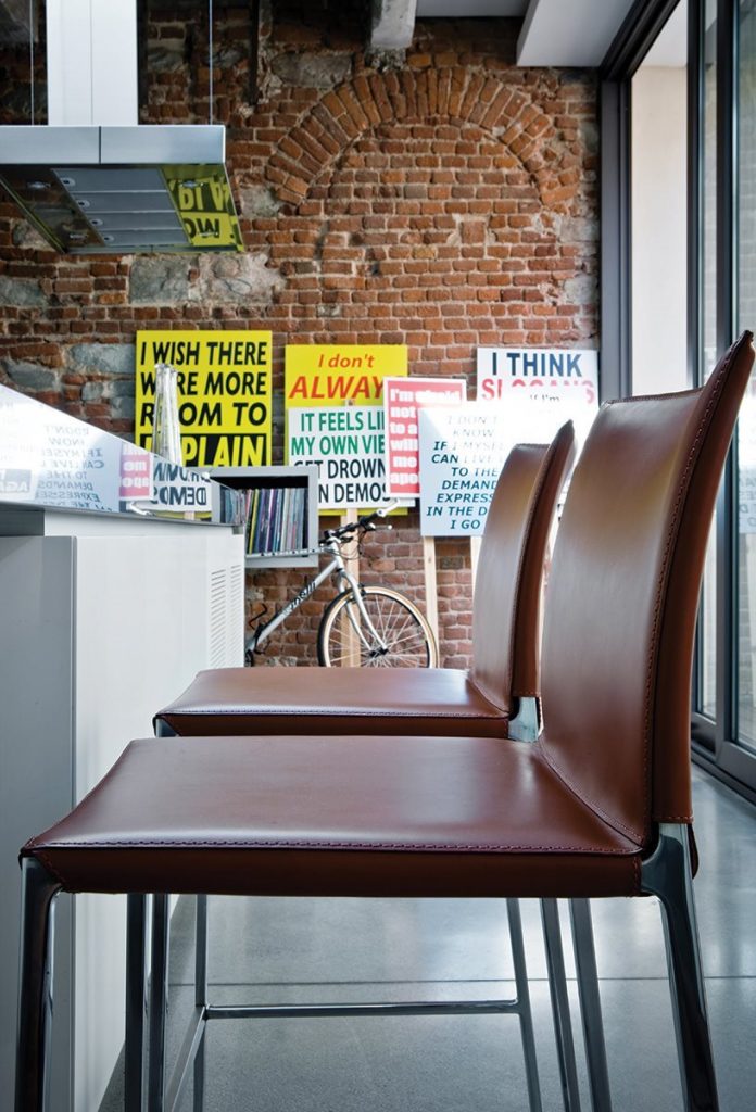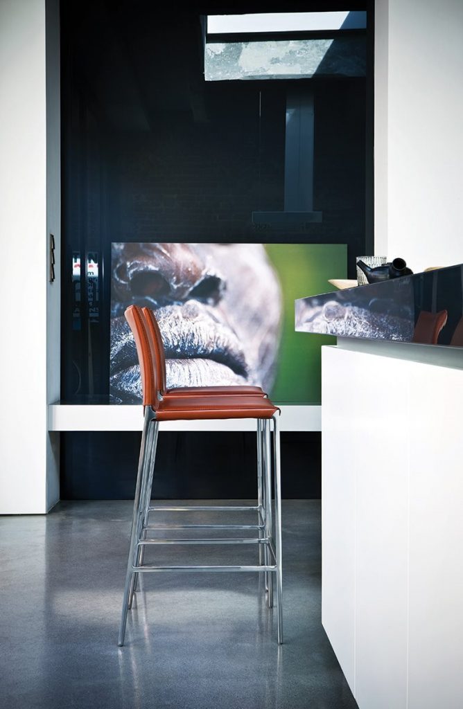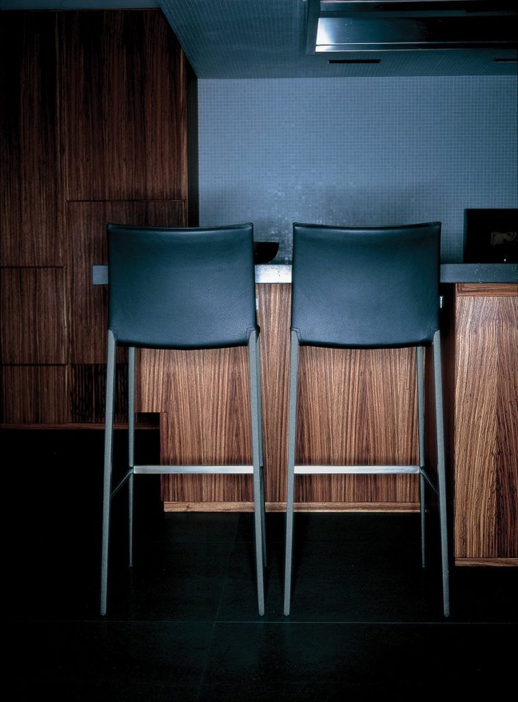 Frame in aluminum alloy (2292) or in polished aluminum alloy, or painted black, graphite or white (2291). Seat and back with polyurethane upholstery. Removable cover in fabric or leather or non-removable in cowhide. Footrest in satin- finished stainless steel. Upon request a 100% white cotton loose stool cover to be put on without fixing, covering seat and backrest, can be supplied.
