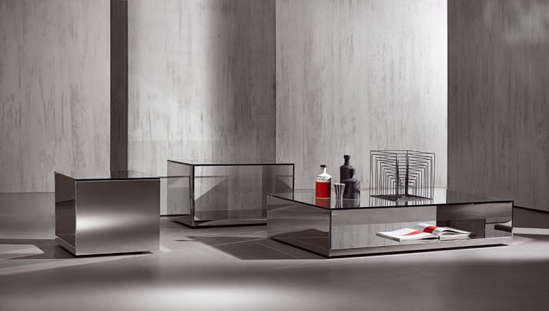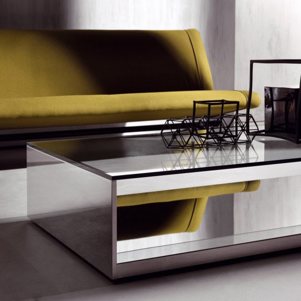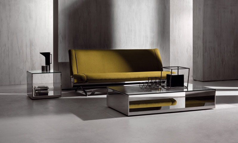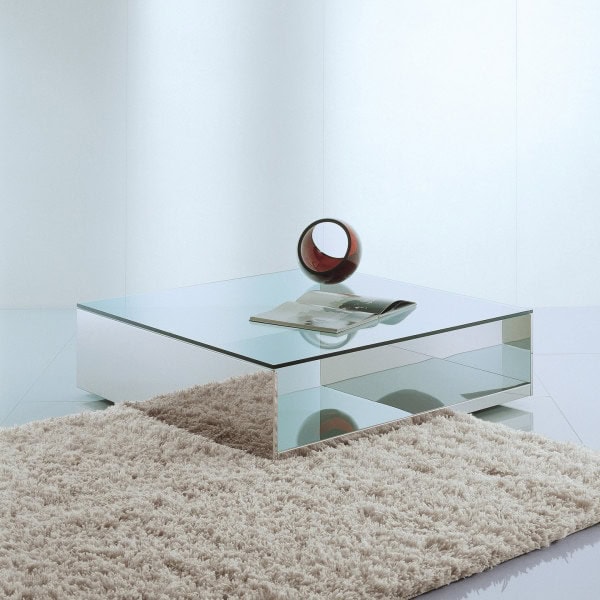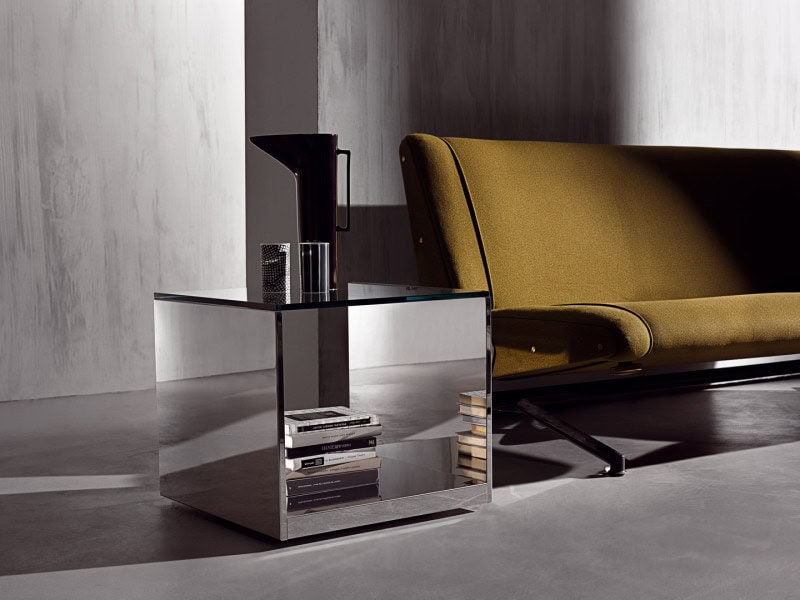 Elegant and precious low tables in bright polished stainless steel and glass, characterized by an intriguing game of reflections and transparencies. The use of "neutral" materials makes them suitable for different interiors. In different dimensions and heights, can be used as cocktail tables, side tables or occasional tables. Can be disassembled.