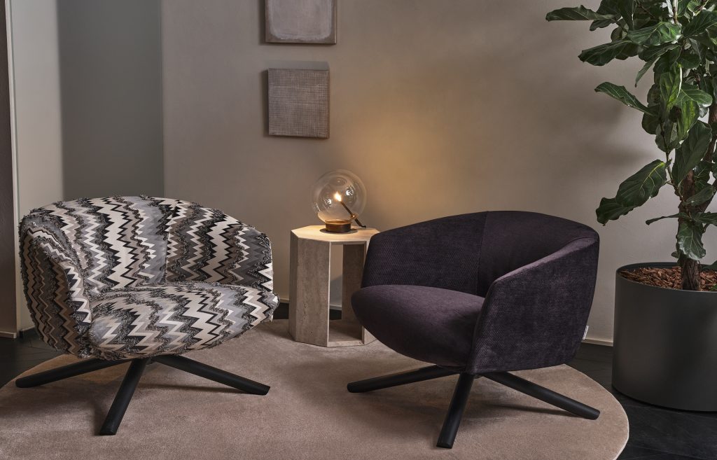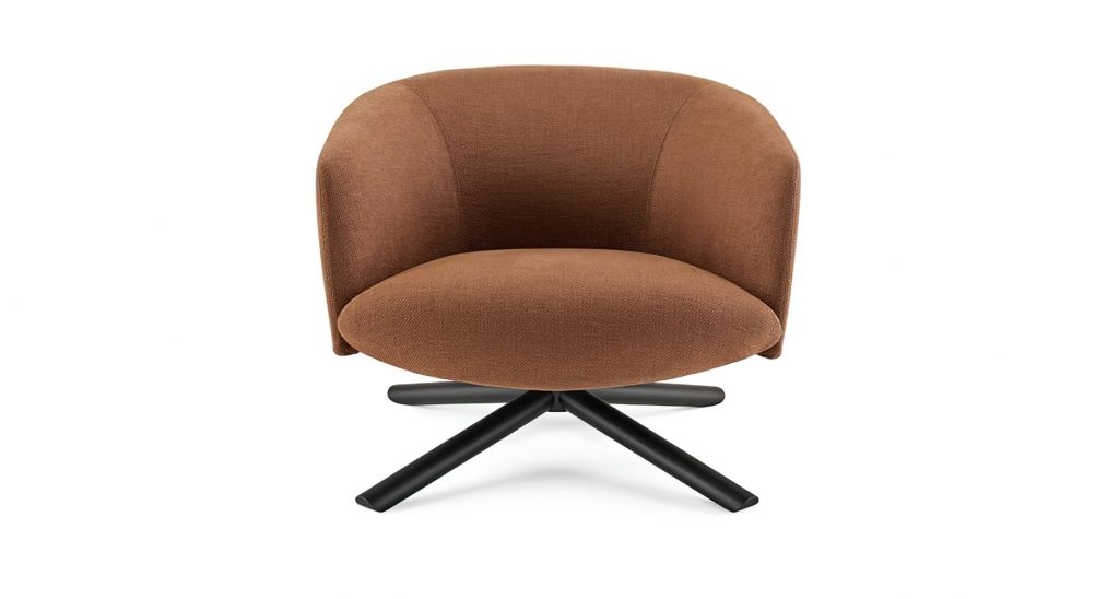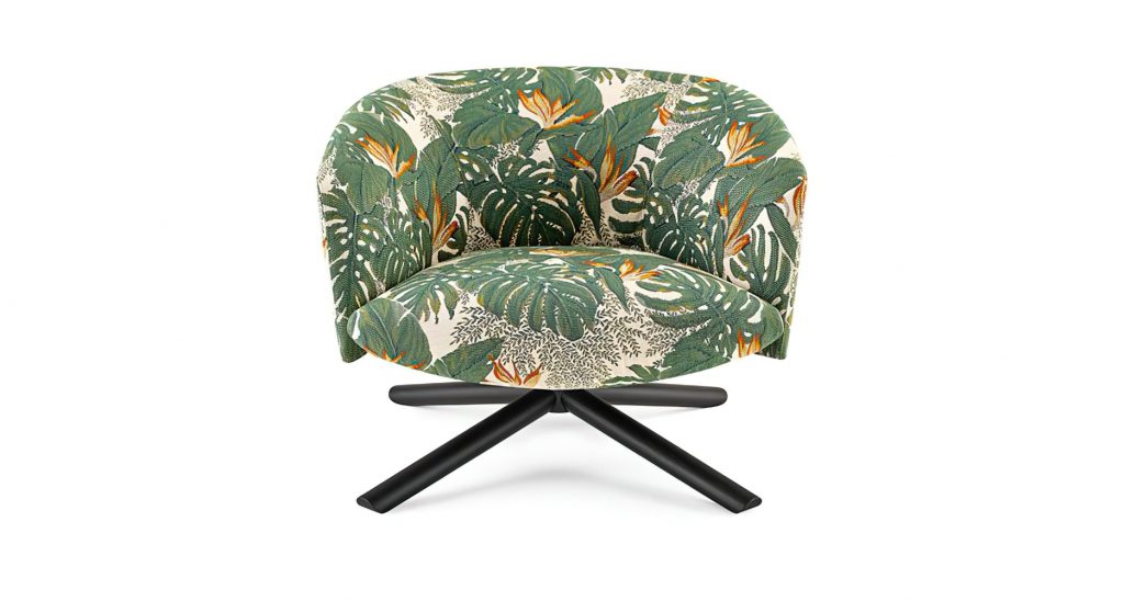 Armchair with internal structure in wood and by-products and metal parts. Padded with fire-resistant non-deformable foam polyurethane in different densities and fire-resistant polyester fiber. Black painted steel structure covered by black open pore lacquered solid ash. 360° swivel movement with the return. Available covered by fabric or leather as per samples. Removable covers.