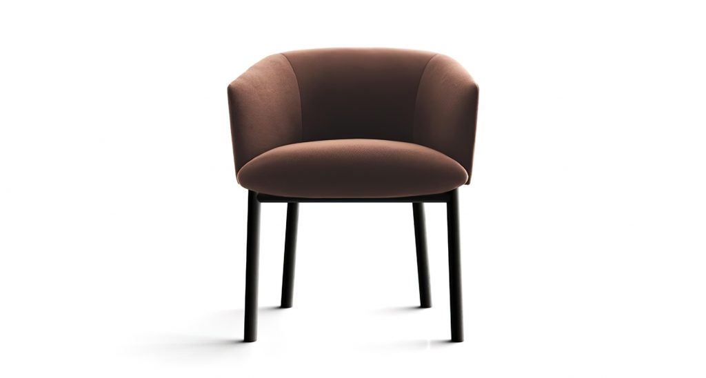 Chair with internal structure in wood and by-products. Padded with fire resistant non-deformable foam polyurethane in different densities and fire resistant polyester fibre. Black open pore lacquered solid ash base. Available covered by fabric or leather as per samples. Not removable cover.