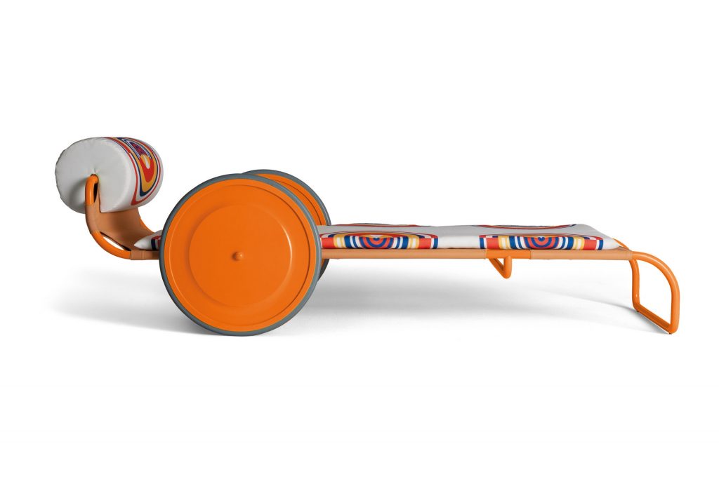 An iconic sun lounger with the effervescence of spherical and tubular forms, a tribute to 1960s two-dimensionality. Tubular steel painted in various colors. Handmade cushions with fabric covers printed with the exclusive Locus Solus artwork or available in all of the Exteta fabric sample colors. All covers are completely removable and washable.