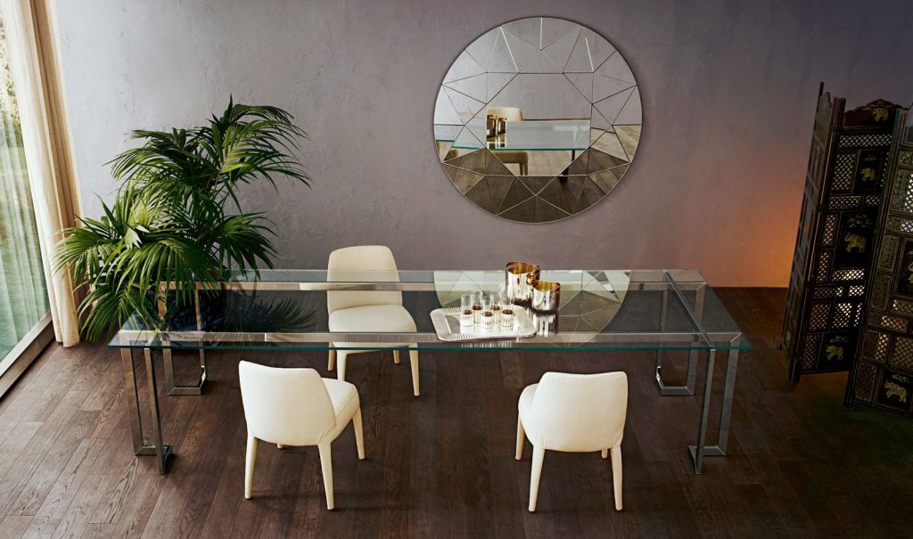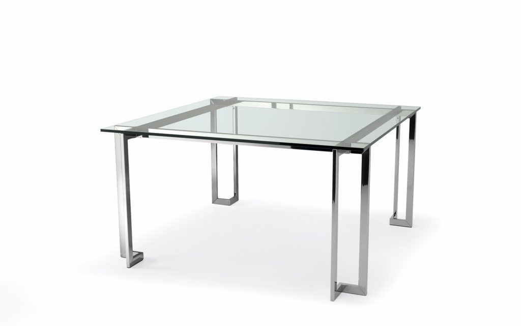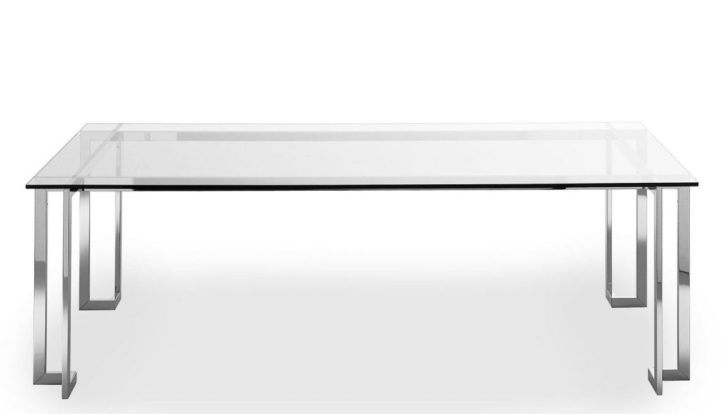 Table with 15mm transparent glass top. Painted glass as per samples in the bright or satin version, on request. Structure in bright stainless steel (40x20x2mm). Available also in satin stainless steel or embossed white or black lacquered steel. For the XL versions, from 260x110 cm, the top is always in 19mm transparent glass. Bright or satin stainless steel structure (50x25x3mm). Customized sizes for the top on request.