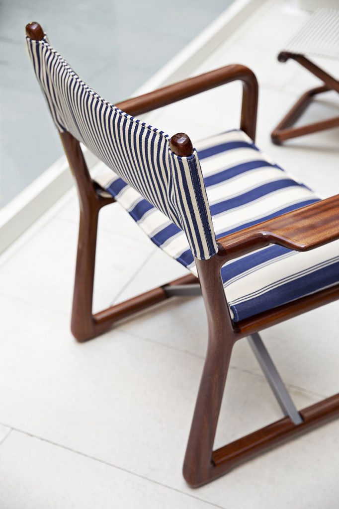 An encounter beween wood and fabric gives life to a chair with languid outlines and a Mediterranean flavor. The structure in Sapelli mahogany is pleasing to the eye and soft to the touch. A robust core, compact and fully handmade, it supports without weighing it down. The fabric bears the signature and unmistakable taste of Loro Piana, an absolute leader in the home textile industry and worldwide style icon. From the meeting of these two worlds comes the delicacy of the textile parts, pleasant to the eye and to the touch, which complete the delicacy of the wood. The refined shapes come from a respect for the aesthetic that never leaves functionality behind.