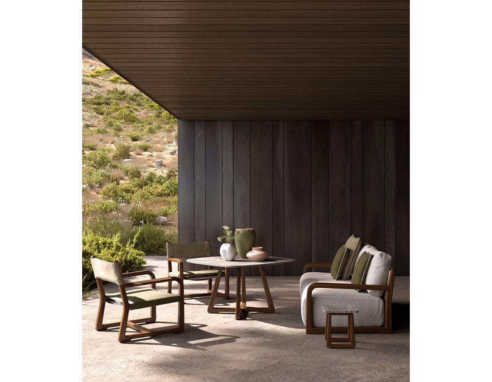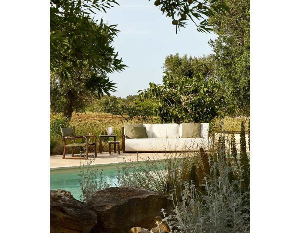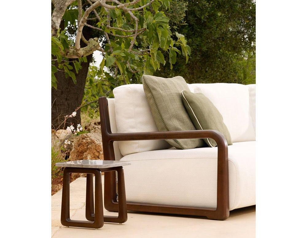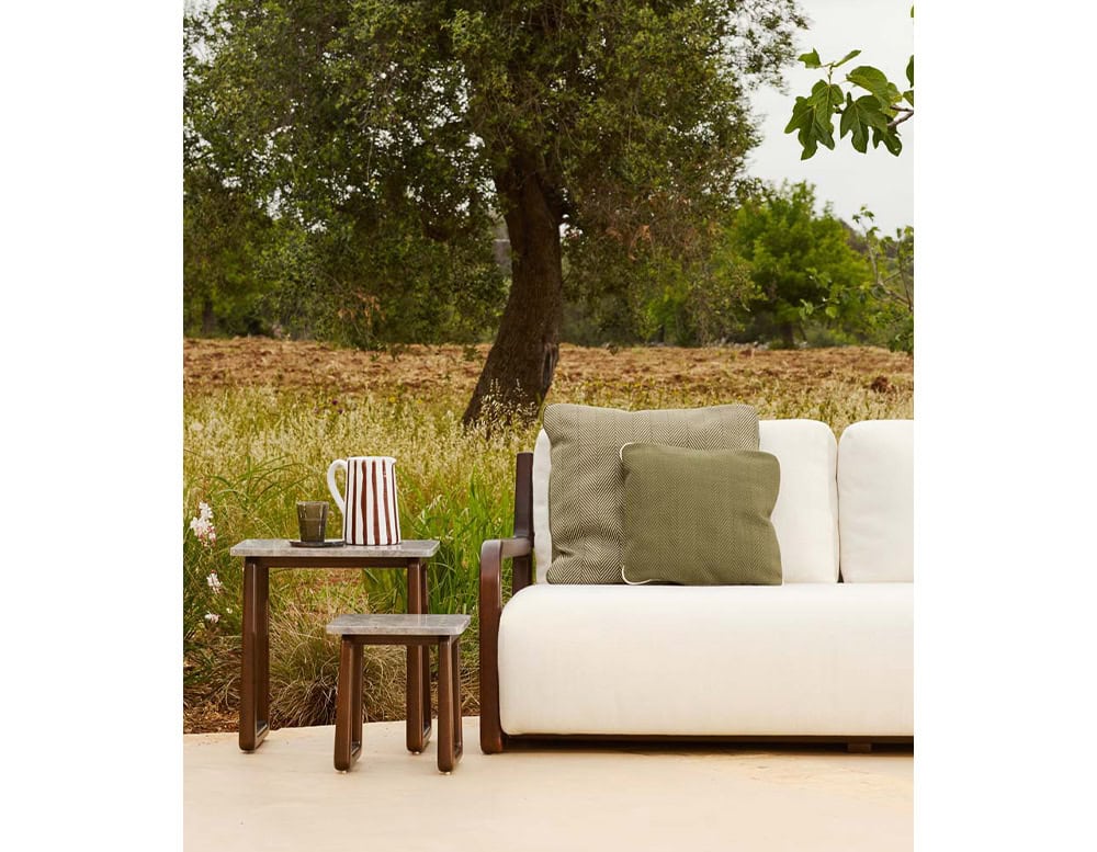 This modular sofa offers a plush and enveloping experience, pushing the boundaries of upholstery. Through extensive research into techniques and materials, it redefines outdoor comfort, ensuring maximum softness and waterproofness in any weather.