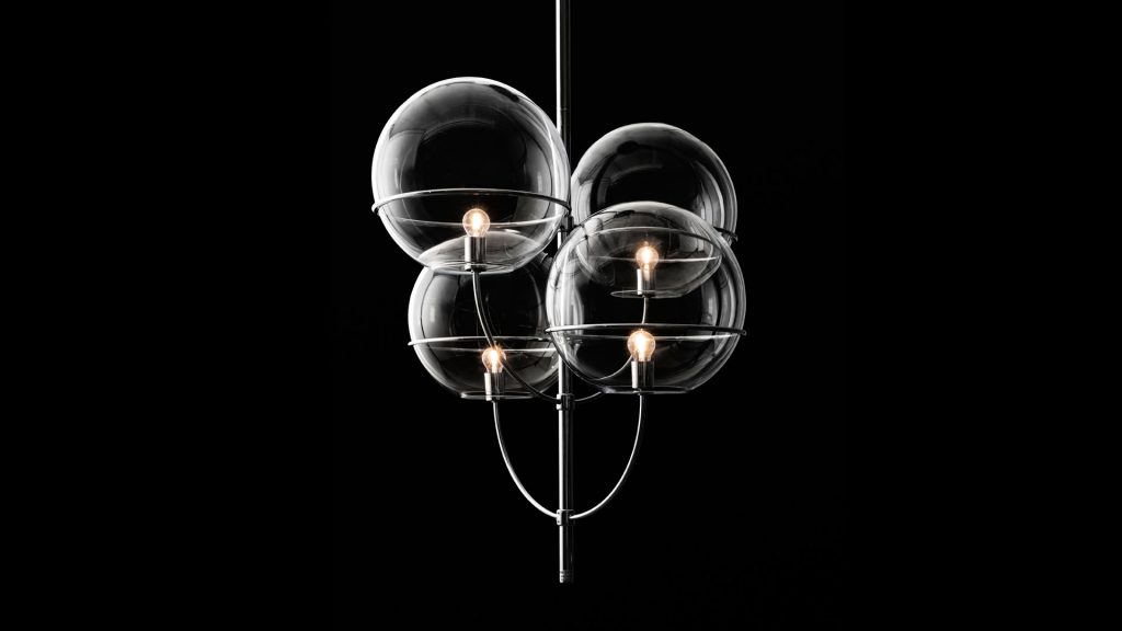 The candelabra-style body with chromed-plate or satin gold finish, typical of the family of lamps designed by Magistretti, can, from time to time be bent according to the required use of the lamp, extending to enclose the transparent glass spheres, inside which the light bulb is hosted.