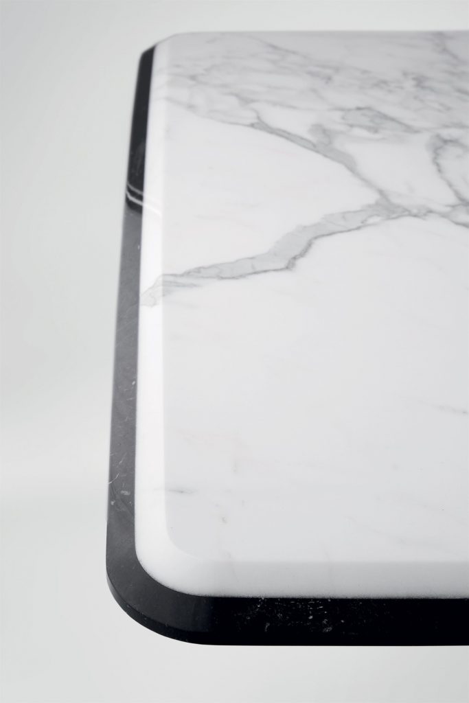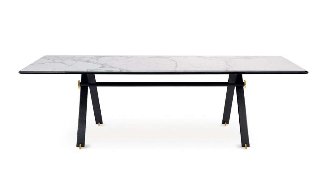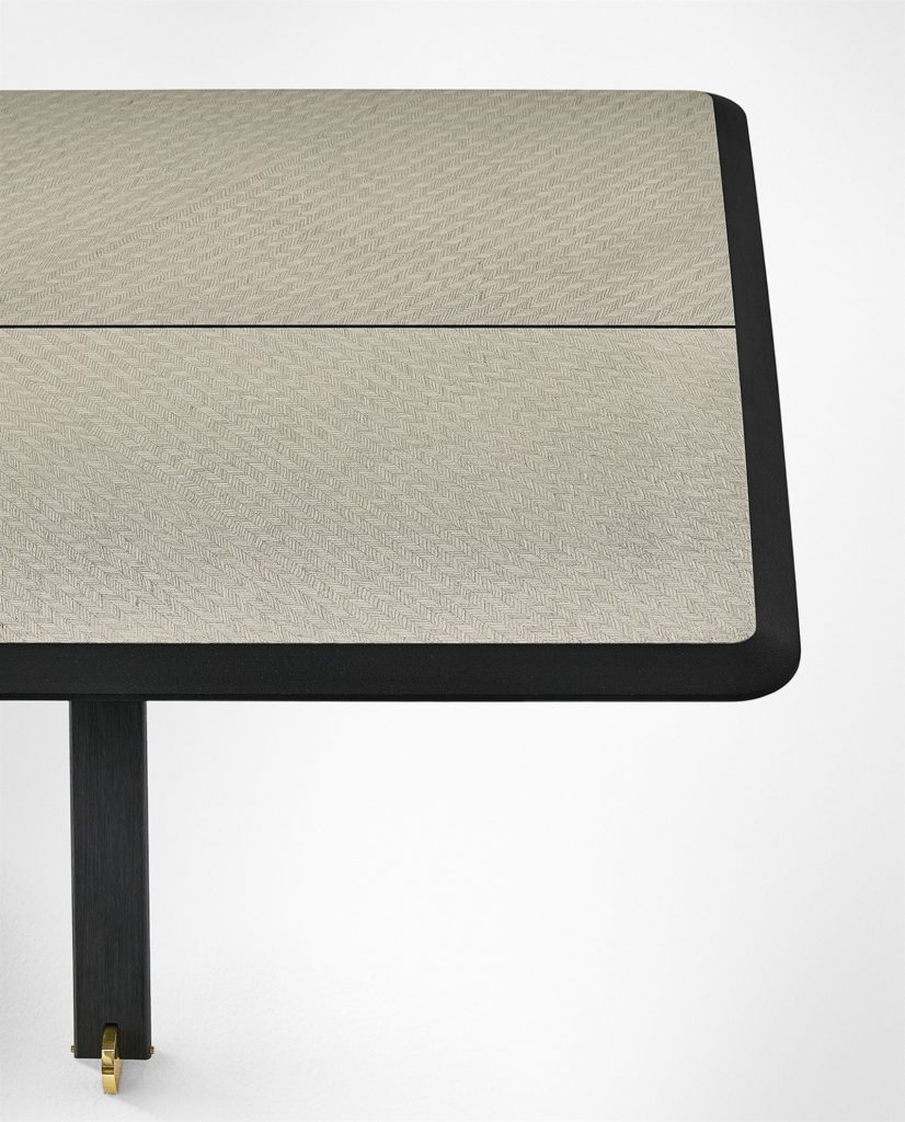 Table with black hand brushed anodised aluminium structure. Bright brass details. Inlaid wooden top with 'Tweed' pattern. Available also in Bianco Statuario and Nero Marquinia marble laminated bevelled top. 15mm painted bevelled glass top as per samples in the bright or satin version, on request.