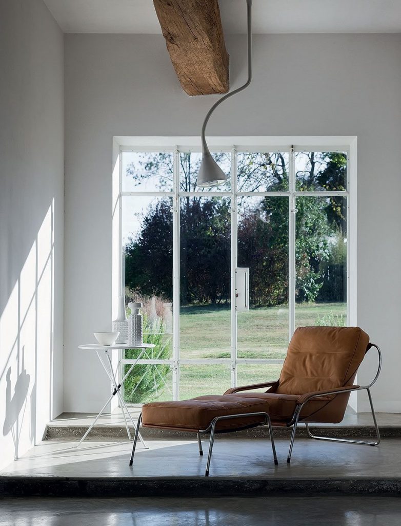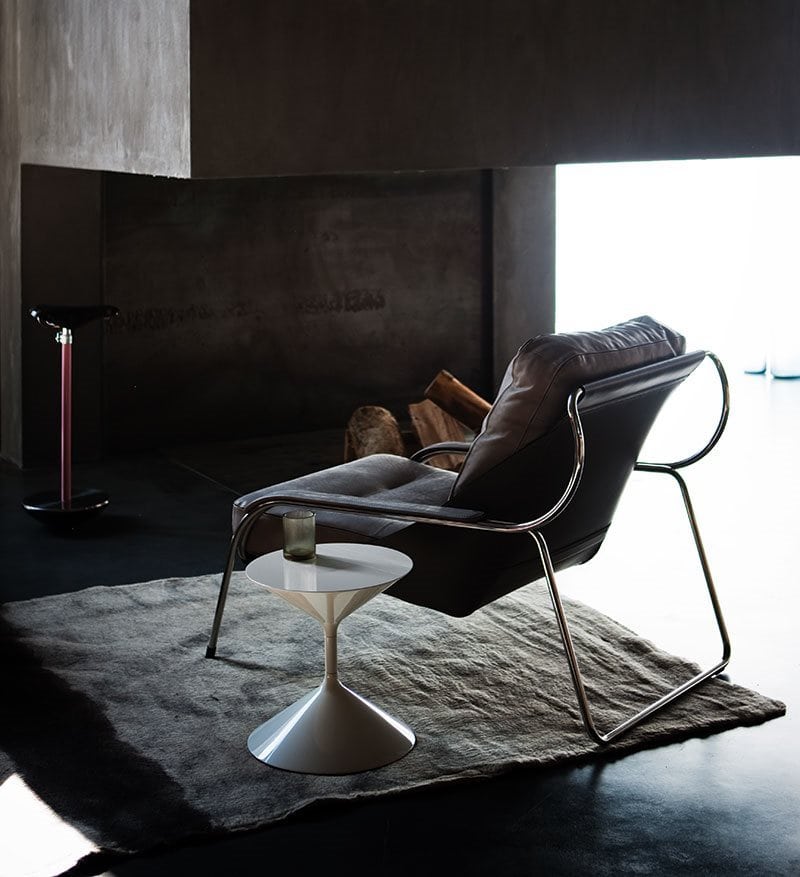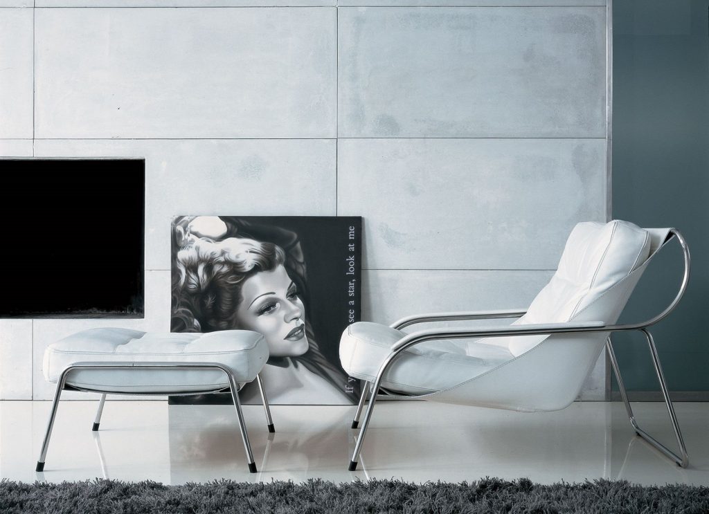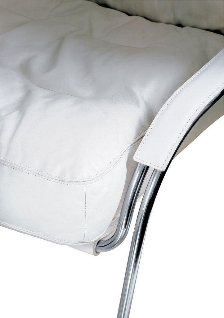 Ø 18 mm, 18/8 polished or black painted steel tubular frame or with natural or black nickel-satin finish. Sling in cowhide pigmentato 90. Back cushion in new goose feathers. Seat cushion upholstered in polyurethane/ Dacron Du Pont. Cushions and armrests covers in Ecofire or leather.