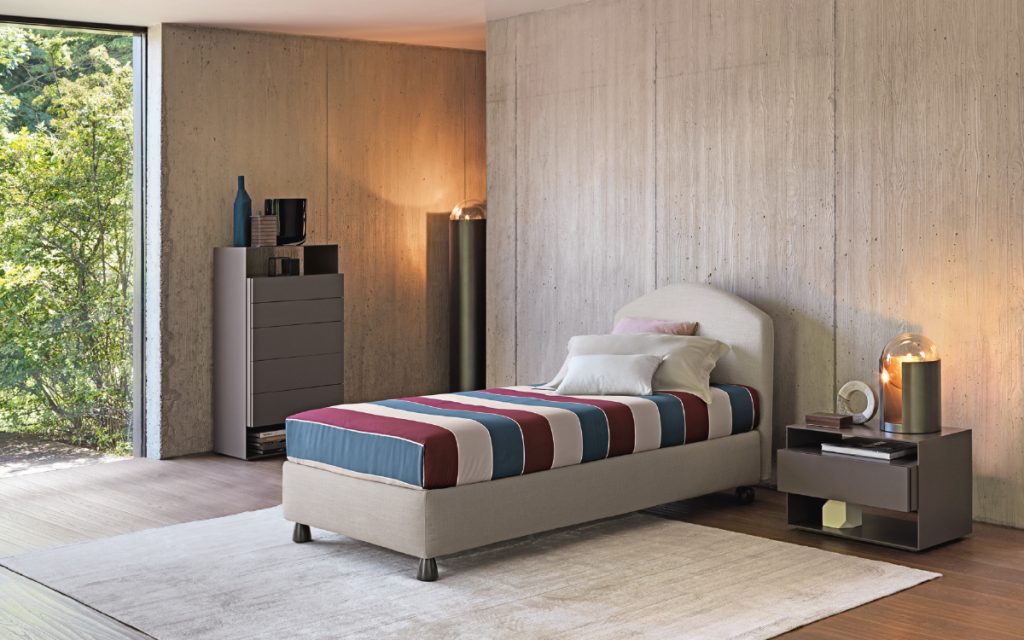 A romantic timeless bed. Padded headboard and base with fabric, leather or Ecopelle covers, completely removable thanks to practical Velcro. Available with box -spring base Leonardo, storage base, fixed base h 25 cm or h 16 cm and with electrical movements.