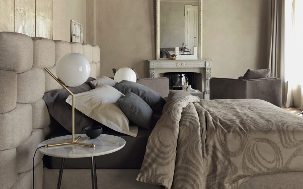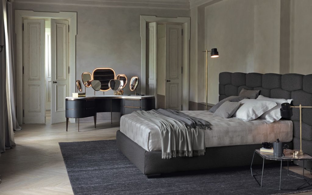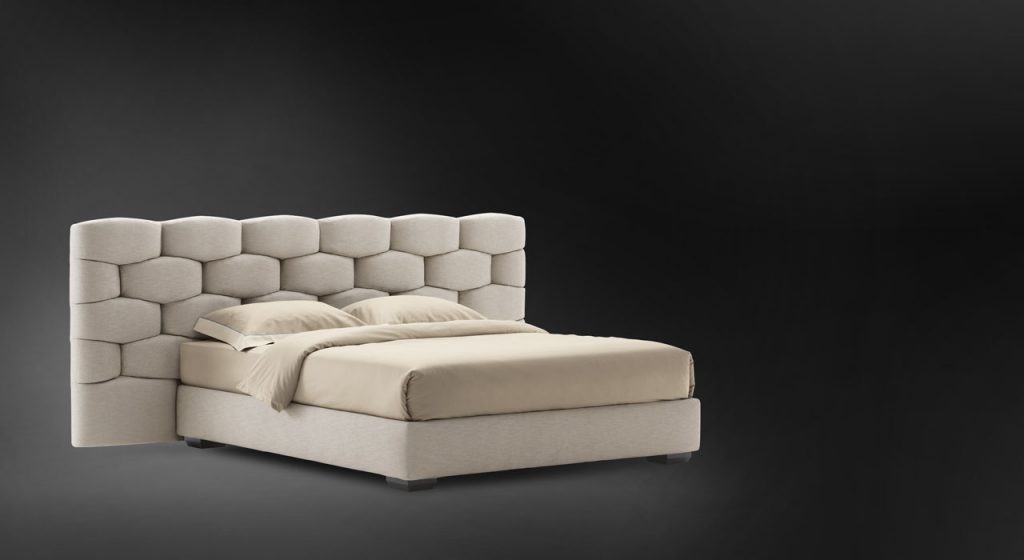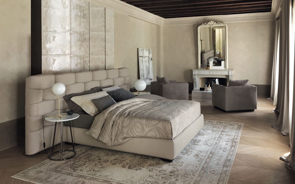 A beautiful double-size bed, the key features are the sumptuous fabrics, clearly visible in the geometric shapes of the headboard, that resembles a modern boiserie. The headboard is available in two versions: aligned with the edge of the bed, or extended from the sides of the bed. The bed Majal can be supplied in fabric with removable cover. It is available with: box-spring base Leonardo, storage base, fixed base or base with electrical movements.