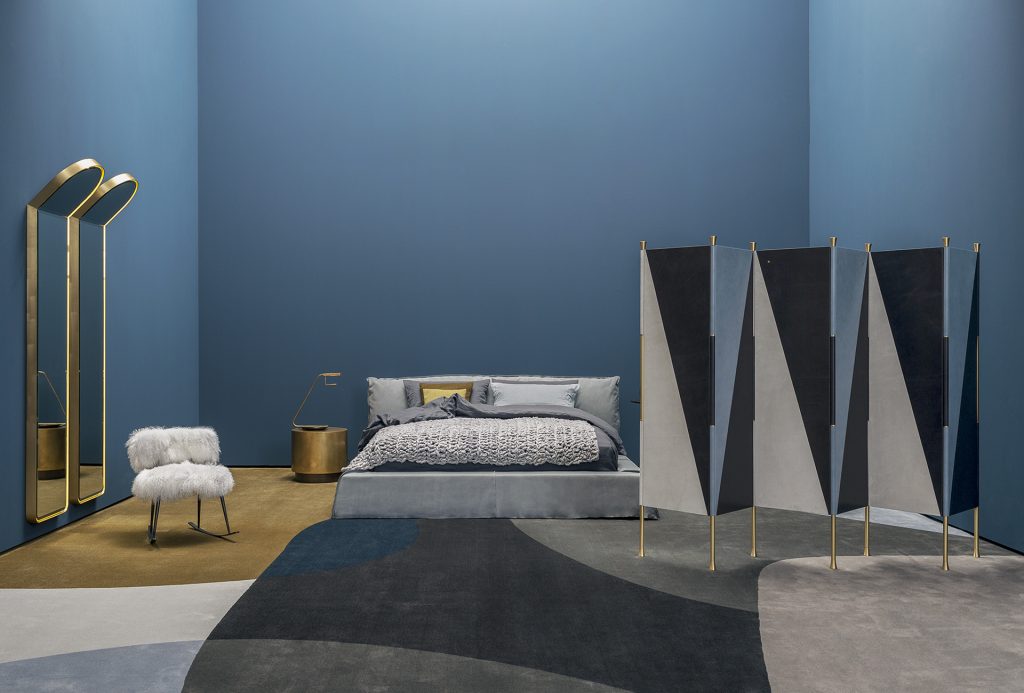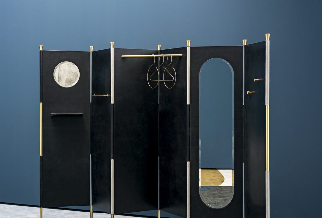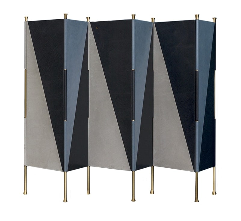 Screen/ Room divider with six multicolor, leather panels. Comes with a mirror, brass accessories, and furnishings. This product is discontinued.
